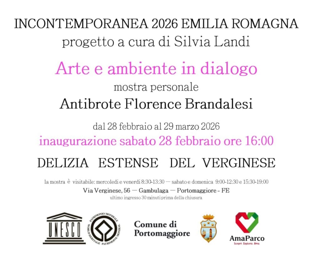 La mostra personale è inserita nella kermesse che apre alla delizia Estense del Verginese, il 28 febbraio ore 16:00 con due collettive d’arte, “Verginese - Portomaggiore” e “Passato e presente”, due mostre personali “Arte e ambiente in dialogo” e “Personaggi del passato”, rispettivamente di Antibrote Florence Brandalesi e Fabiana Toffano, la performance di Roberto Bellucci, un gruppo consolidato di artisti, parenti e amici della scrittrice Silvia Landi, per la VIII edizione di INCONTEMPORANEA 2026 Emilia Romagna.