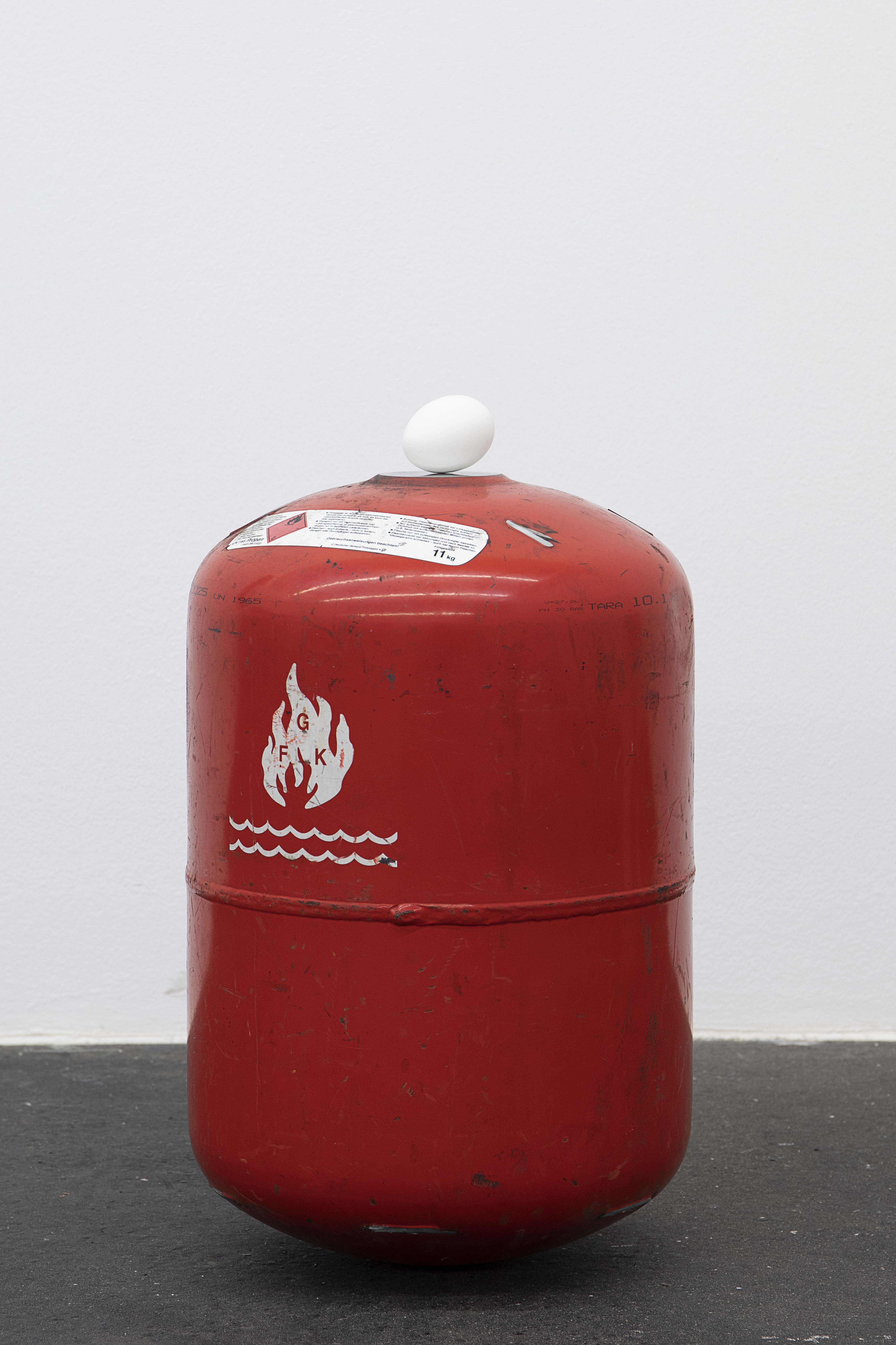 So if the egg as a container obviously evokes a content involving life and therefore high and auratic categories and principles, the industrial reality and mass-production mostly succeeds in disposing this aura. The title giving series Sealed Vessels contrasts eggs with human-made industrial metal containers featuring quite similar shapes. Reduced to their basic forms, with all attachments cut off and the openings sealed through welding, these standard containers for gases and liquids serve as a pedestal for the natural paradigm (the egg) which, regarding its strangely balanced position on the metal containers, might seem somehow attached to its epigone.