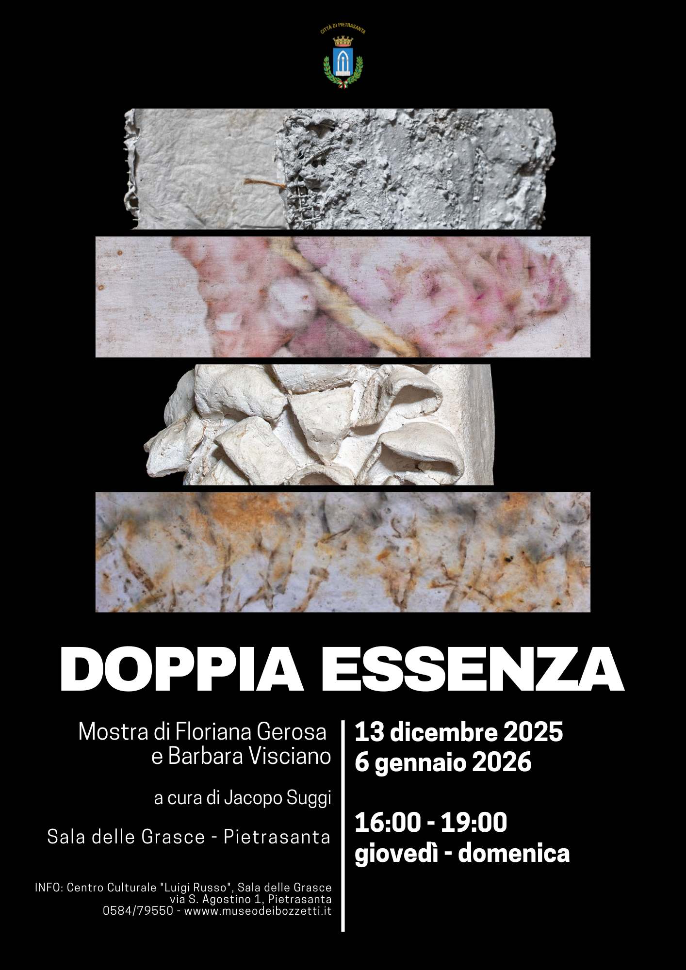 Il Centro Culturale “Luigi Russo” e la Sala delle Grasce di Pietrasanta ospitano, dal 13 dicembre 2025 al 6 gennaio 2026, la mostra Doppia Essenza, che mette in dialogo le ricerche di Floriana Gerosa e Barbara Visciano, due artiste che, attraverso linguaggi e processi differenti, interrogano la materia come organismo vivo, luogo di memoria e trasformazione.