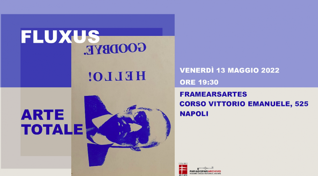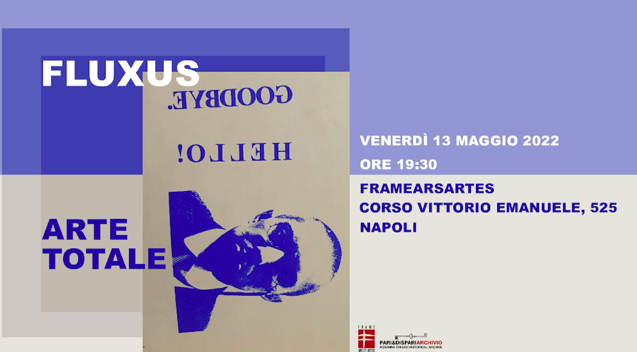 FLUXUS – ARTE TOTALE. Vernissage 13 maggio 2022, ore 19:30 alla FrameArsArtes di Napoli, in Corso Vittorio Emanuele, 525. In occasione del ’60 anniversario della nascita di Fluxus, FrameArsArtes e Pari&Dispari- Archivio, propongono un omaggio a Rosanna Chiessi