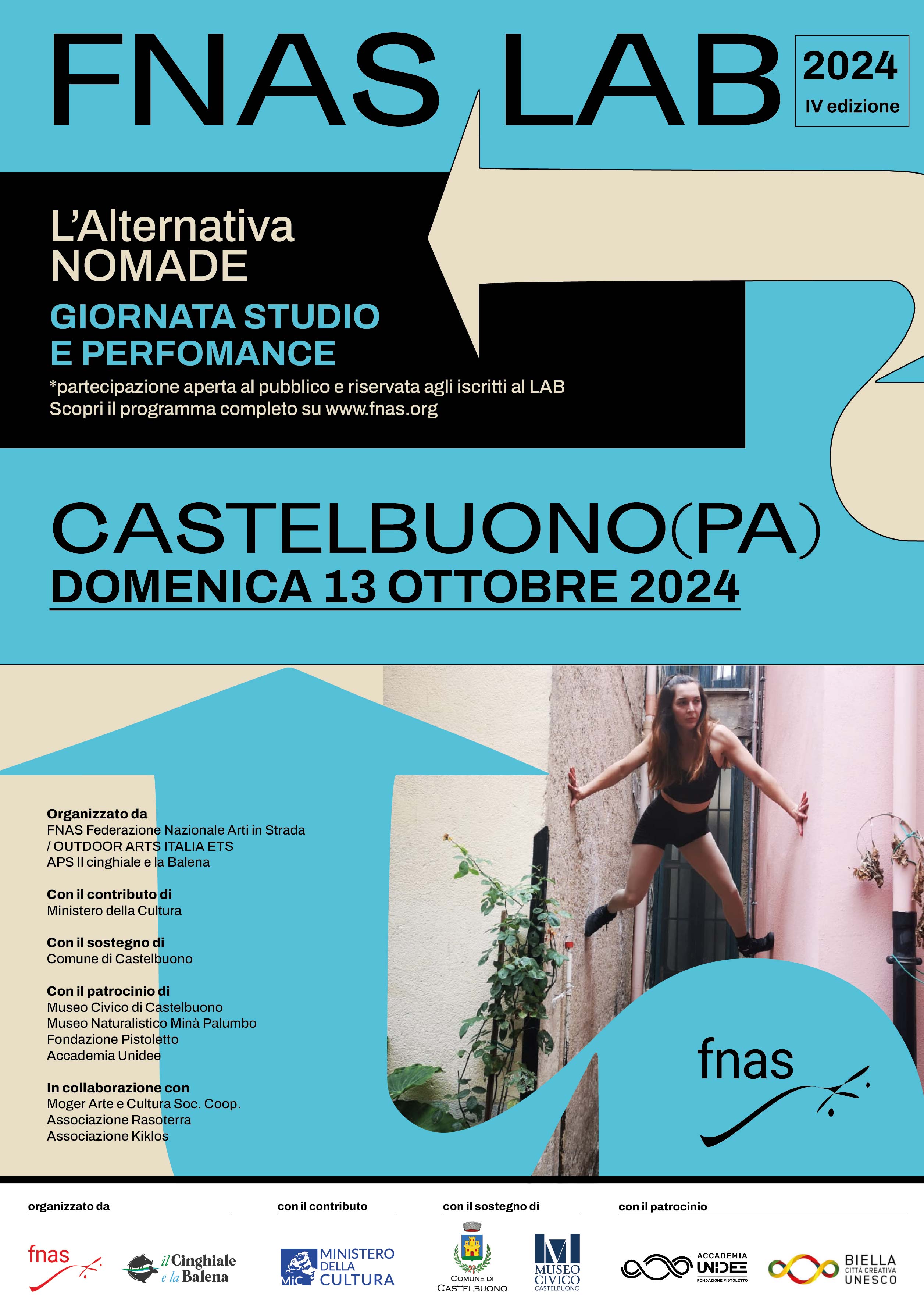 FNAS Lab è organizzato da FNAS Federazione Nazionale Arti in Strada (OUTDOOR ARTS ITALIA ETS), APS Il cinghiale e la balena. Con il contributo di Ministero della Cultura. Con il sostegno di Comune di Castelbuono. Con il patrocinio di Museo Civico di Castelbuono, Museo Naturalistico Mina Palumbo, Fondazione Pistoletto e Accademia Unidee. In collaborazione con Moger arte e cultura Soc. Coop., Associazione Rasoterra e Associazione Kiklos.
