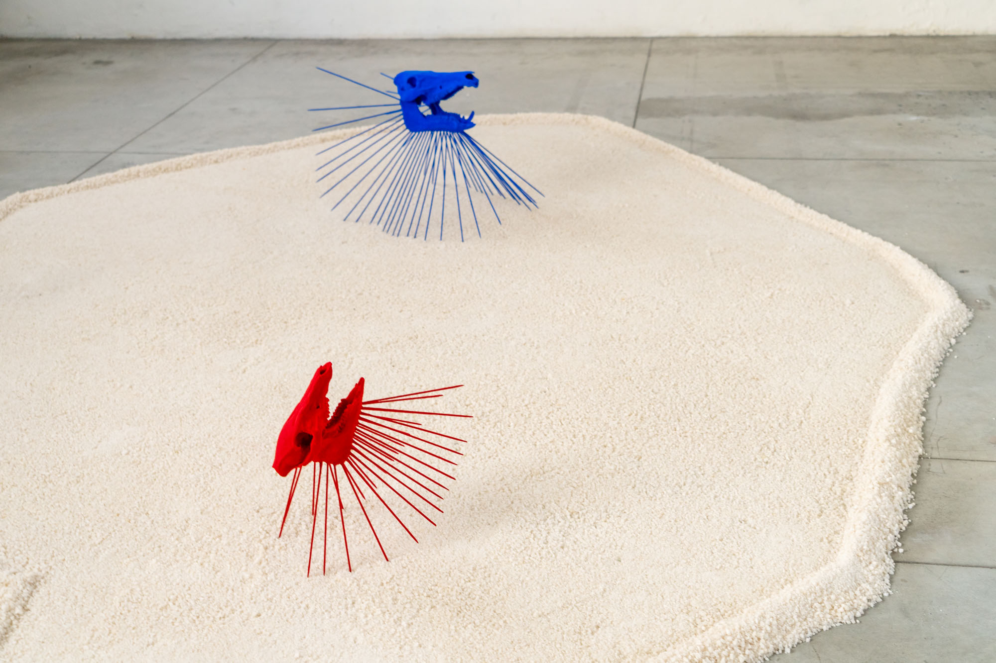 Forme e colori caratterizzano il mondo di Luca Petti attento all’interazione tra esseri vegetali e animali. L’artista approccia la materia attraverso un processo di floccatura elettrostatica, conferendo alla su¬perficie delle sue sculture una copertura vellutata.