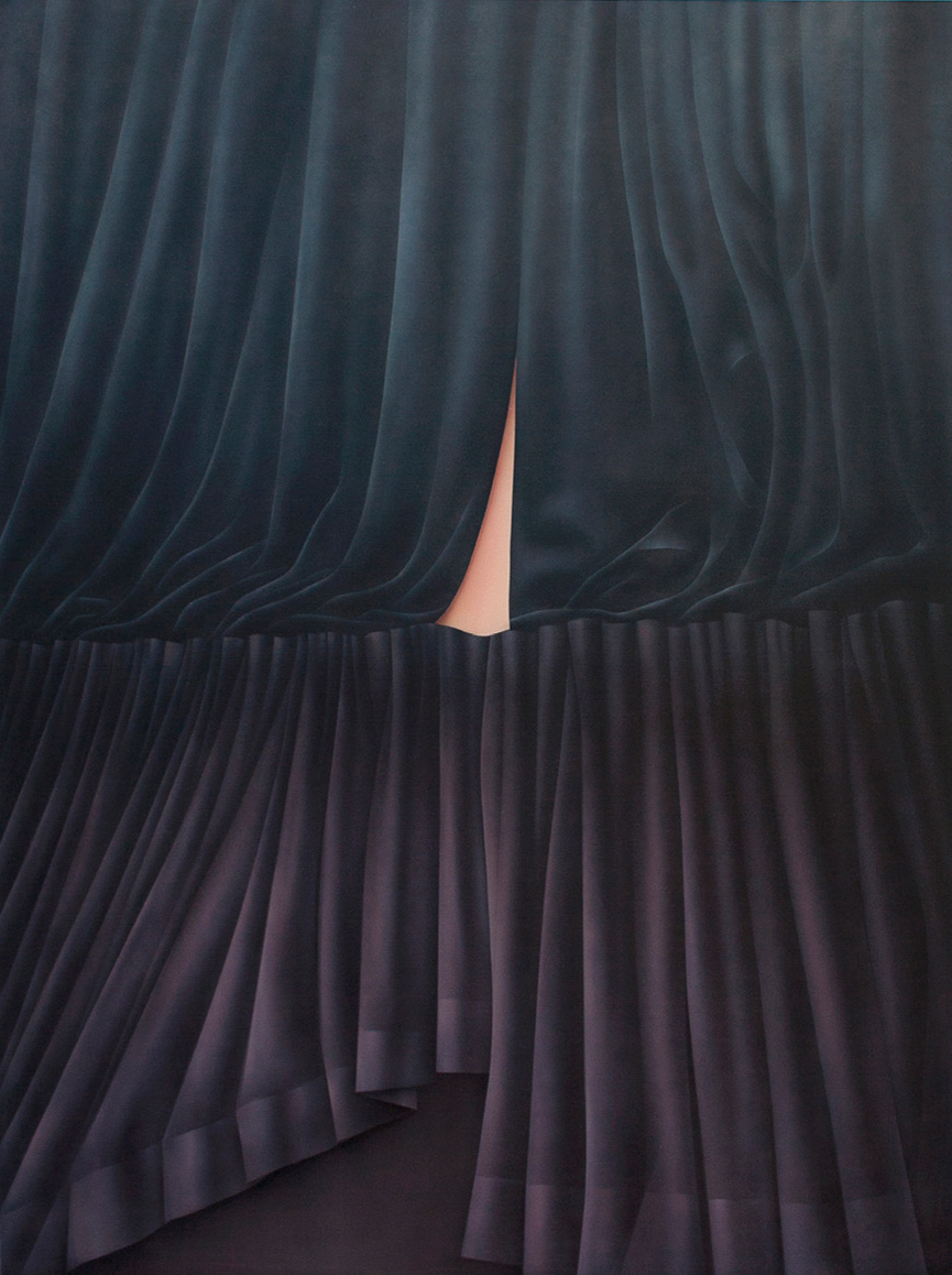 Specialmente ne La tenda Blu, Barth esaspera la qualità tettonica del drappeggio, è come se fosse scolpito dalla roccia, trasformando il morbido velluto nel suo opposto. Nella Tenda color Oltremare si percepisce un richiamo alla rigorosa semplificazione geometrica medievale. Al contrario, il dipinto Ocra evoca la pelle umana, morbida e organica. Barth guarda alle tende come testimonianze di vita privata.. Le tende sono uno dei pochi oggetti di arredo domestico onnipresenti a cui è concesso il permesso di mostrare una piccola dose di frivolezza. Per secoli, le tende che accompagnavano le finestre hanno rappresentato lo status sociale e l’identità della famiglia. Non solo per la scelta del tessuto e del disegno delle pieghe, ma anche per la decisione di tenerle aperte o chiuse. Pertanto, vi è un’autoindulgenza nei confronti del mondo esterno, unita alla funzione cruciale delle tende, che utilizziamo per proteggerci dal mondo esterno. Che si tratti del sole, del freddo o della sorveglianza. Notabilia
