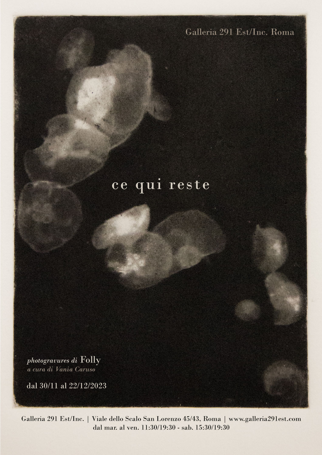 “Ce qui reste” è un progetto espositivo composto da una serie di opere calcografiche realizzate con la photogravure, tecnica attraverso la quale Folly traspone immagini e parole annotate nei suoi quaderni.