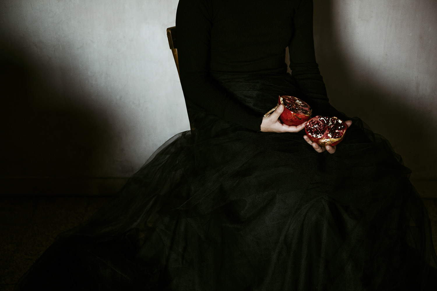 Ilaria Sagaria (Palomonte, Salerno 1989). Fotografa, artista visiva e docente di grafica e fotografia. In Piena di grazia la carne nella sua accezione più terrena si fa protagonista nelle sue fotografie. Ripiegata, straziata, cruda diviene specchio di una trasfigurazione dove l’elemento del sacro è riportato a una visione sensorialmente terrena. Condannato alla grazia, emblema dell’inconciliabilità tra la visione idealizzata e quella reale, il corpo femminile mostra in queste immagini il suo dualismo tra estasi e tormento. La ricerca di precisi effetti chiaroscurali suggerisce un esito quasi pittorico, coadiuvato dalla presenza di dettagli e simboli che attraversano la storia dell’arte, dal melograno, simbolo di fertilità, alle foglie larghe che alludono al pudore con il quale i progenitori si coprono dopo la cacciata dal Paradiso terrestre.