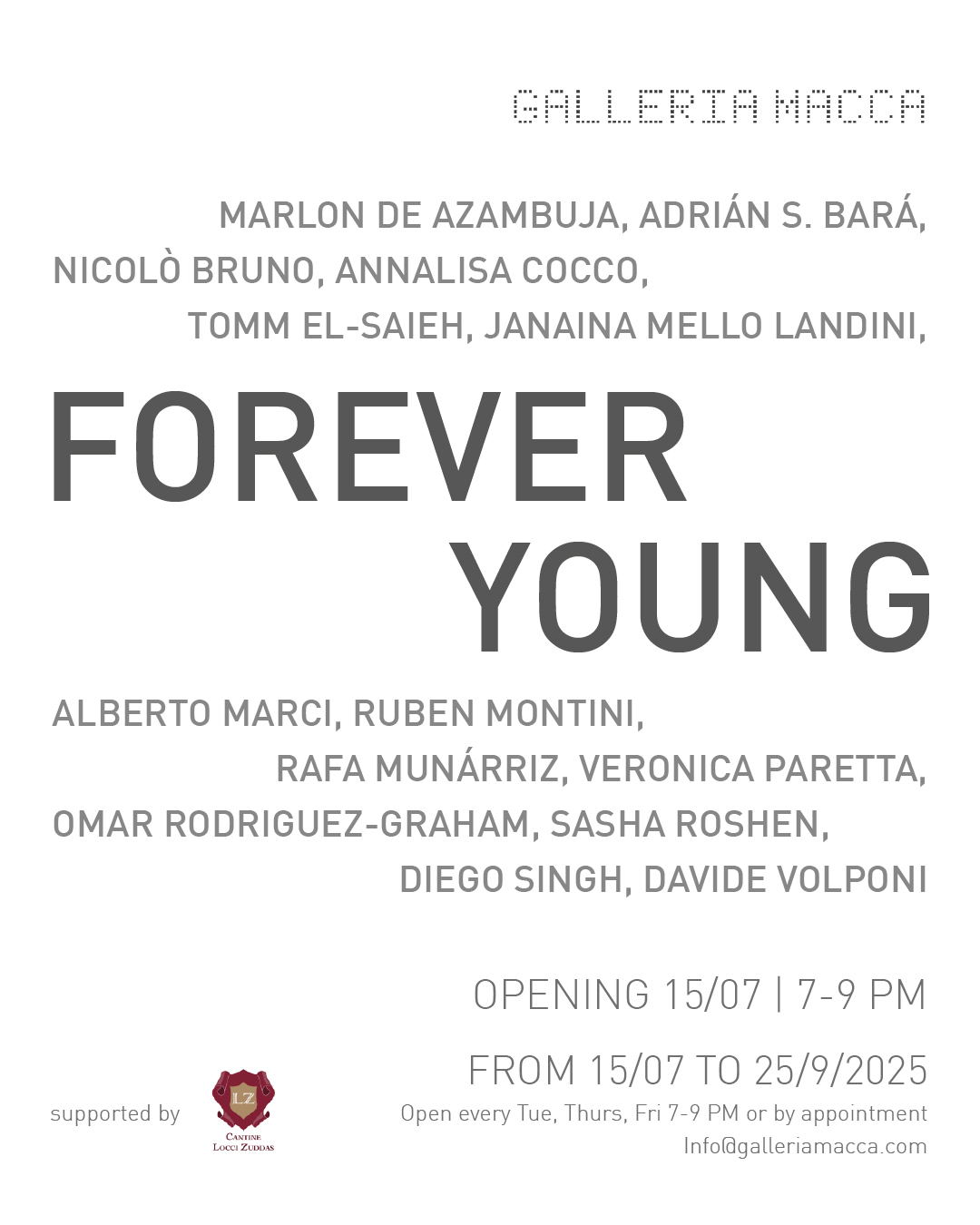 Galleria Macca è lieta di festeggiare il suo decimo anno di attività ed è orgogliosa di presentare FOREVER YOUNG