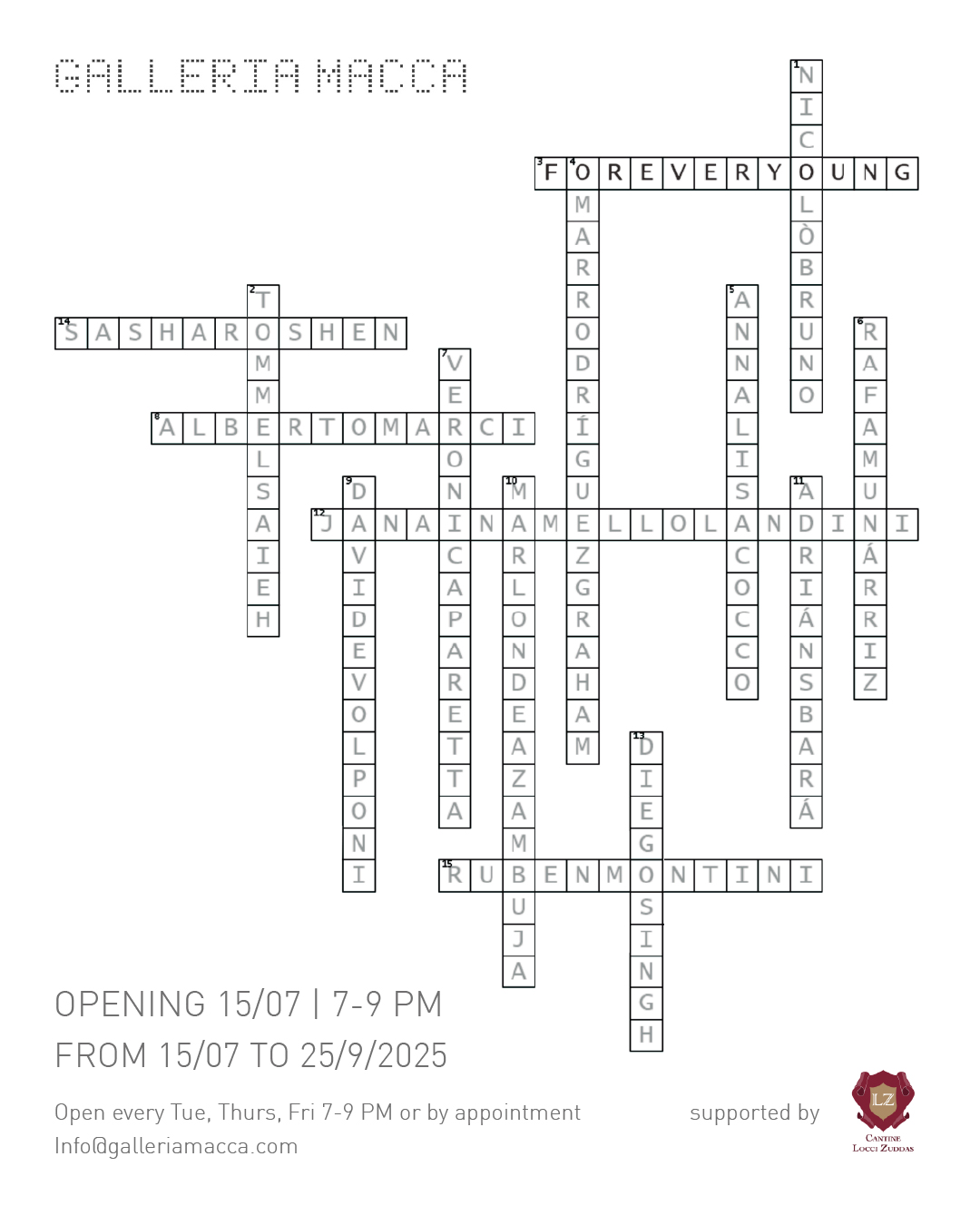 Il vernissage si terrà venerdì 15 luglio, dalle ore 19. La mostra sarà visitabile fino al 25 settembre, ogni martedì, giovedì e venerdì dalle 19 alle 21, o su appuntamento. Ringraziamo per il supporto #CantineLocciZuddas
