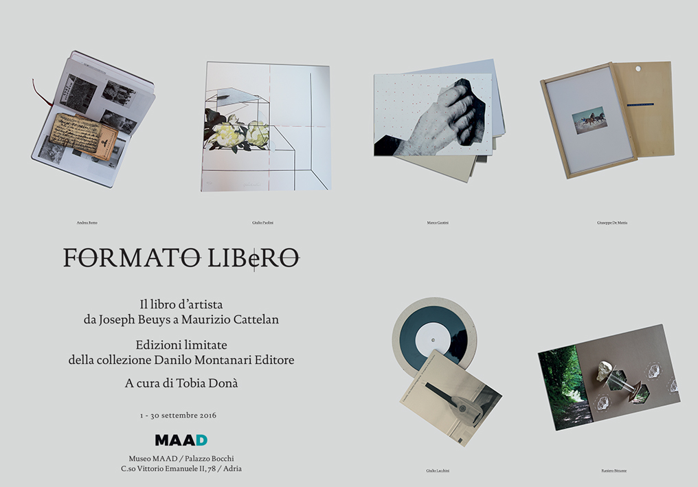 In mostra al Museo MAAD, dal primo di settembre sino alla fine del mese, una selezione di libri d’artista a cura di Tobia Donà provenienti dalla collezione Danilo Montanari, per la maggior parte eseguiti fra gli anni ’60 ad oggi. L’esposizione documenta la storia di questo genere di pubblicazioni attraverso un consistente numero di esemplari significativi e molto rari, tutti pensati, progettati e firmati dagli artisti e spesso contenenti manufatti originali. Vi sono opere di Lucio Fontana realizzate nel 1958 e di Alighiero Boetti del 1986 entrambe con interventi originali. La mostra documenta inoltre il lungo sodalizio tra Danilo Montanari e l’artista Giulio Paolini, dal 1985 ad oggi. Danilo Montanari è editore dal 1980 ed ha pubblicato oltre 700 volumi, in gran parte di arte contemporanea, con particolare attenzione ai libri d'artista. Tra questi le prime edizioni di Maurizio Cattelan. Il libro d’artista è un oggetto che nasce dal progetto di un artista visivo non per illustrarne l’opera, come potrebbe fare un catalogo, ma come “opera” stessa. La loro nascita viene fatta risalire al 1954, quando Yves Klein fece pubblicare a Madrid un testo/opera già precocemente concettuale. Nel 1963, Ed Ruscha, artista statunitense da poco entrato nella corrente Pop, diede alle stampe Twentysix Gasoline Stations. Si trattava di un testo che raccoglieva la pubblicazione di 26 fotografie in bianco e nero di altrettante stazioni di rifornimento, sparse per gli Stati Uniti. Privi di presentazioni e testi critici i libri d'artista sono pensati come un’opera d’arte in sé e sono pubblicati in tiratura limitata. Spesso sono esemplari unici fatti a mano. Il riferimento a queste date fra la metà degli anni ’50 e l’inizio del decennio successivo è importante, perché rimanda a un preciso contesto culturale, sorto insieme al fenomeno delle neo-Avanguardie costituite da gruppi di artisti e movimenti che sperimentano vari linguaggi nel tentativo di garantirsi un’assoluta libertà di espressione. Il libro d’artista trova così una posizione nobile nel panorama dell’arte concettuale degli anni ’70 per la sua duttilità percettiva, l’essere fra opera visiva e lettura, fra oggetto e opera.
