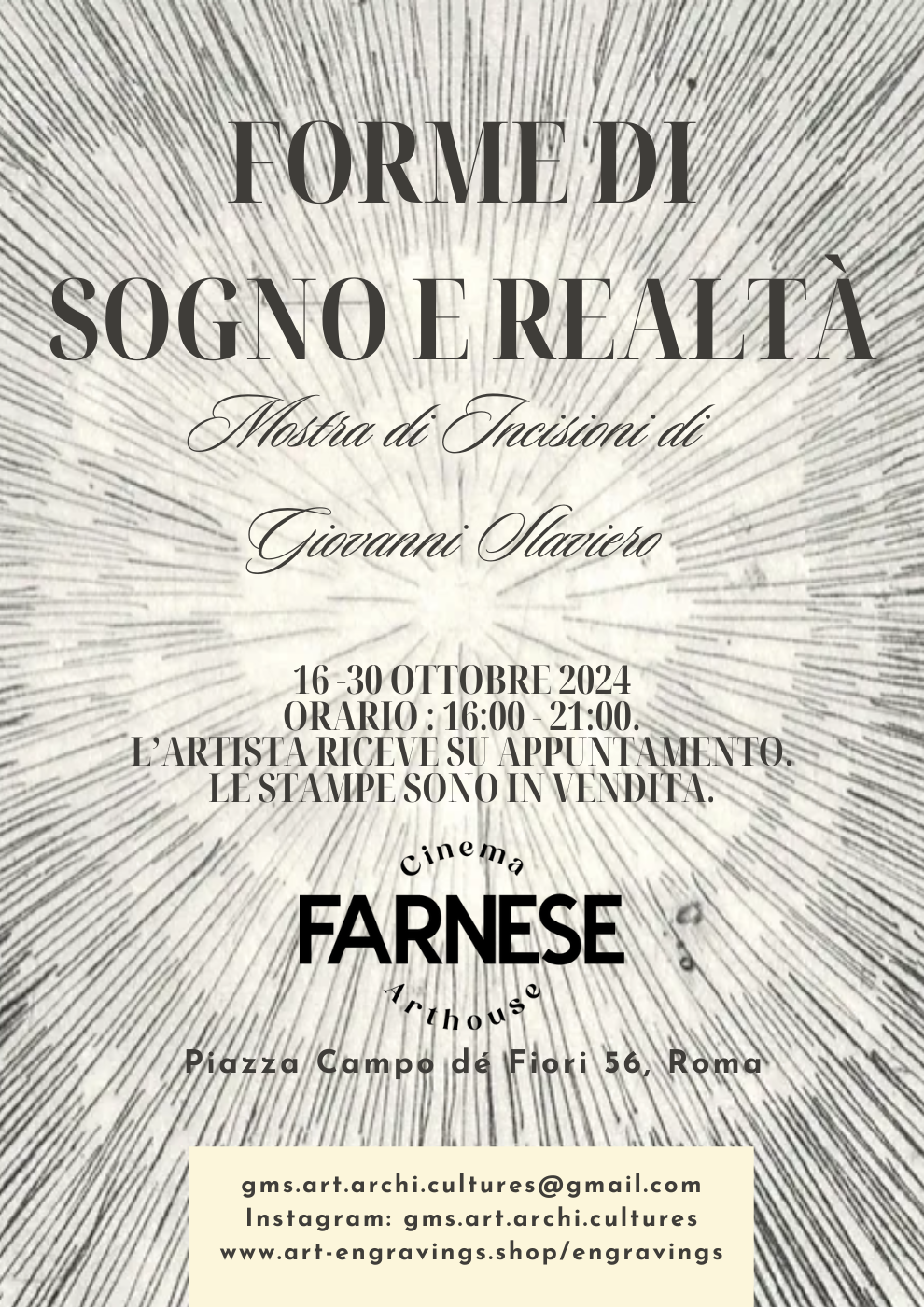 Esposizione personale di 33 incisioni eseguite con tecniche tradizionali, che trattano di vari temi in modo originale tramite un dialogo tra l’ astratto ed il figurativo. L’artista, Giovanni M. Slaviero è un artista emergente di doppia cittadinanza italiana e francese, che vive attualmente a Roma.