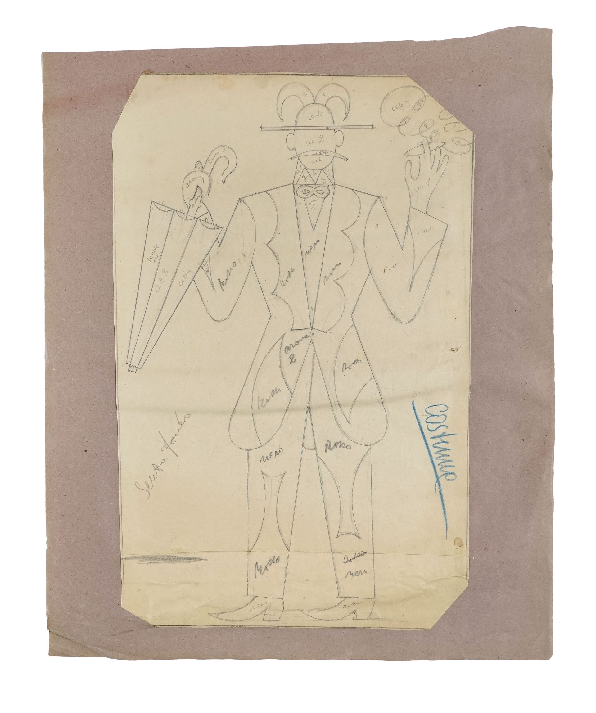 Provenienti da una collezione privata, questi progetti, realizzati a matita su carta, coprono un arco temporale che va dal 1919 al 1928 e testimoniano l’inesauribile vitalità dell’artista: pubblicità della Campari e della Birra, scenografie teatrali, arazzi, cuscini, gilet o panciotti, copertine per riviste.