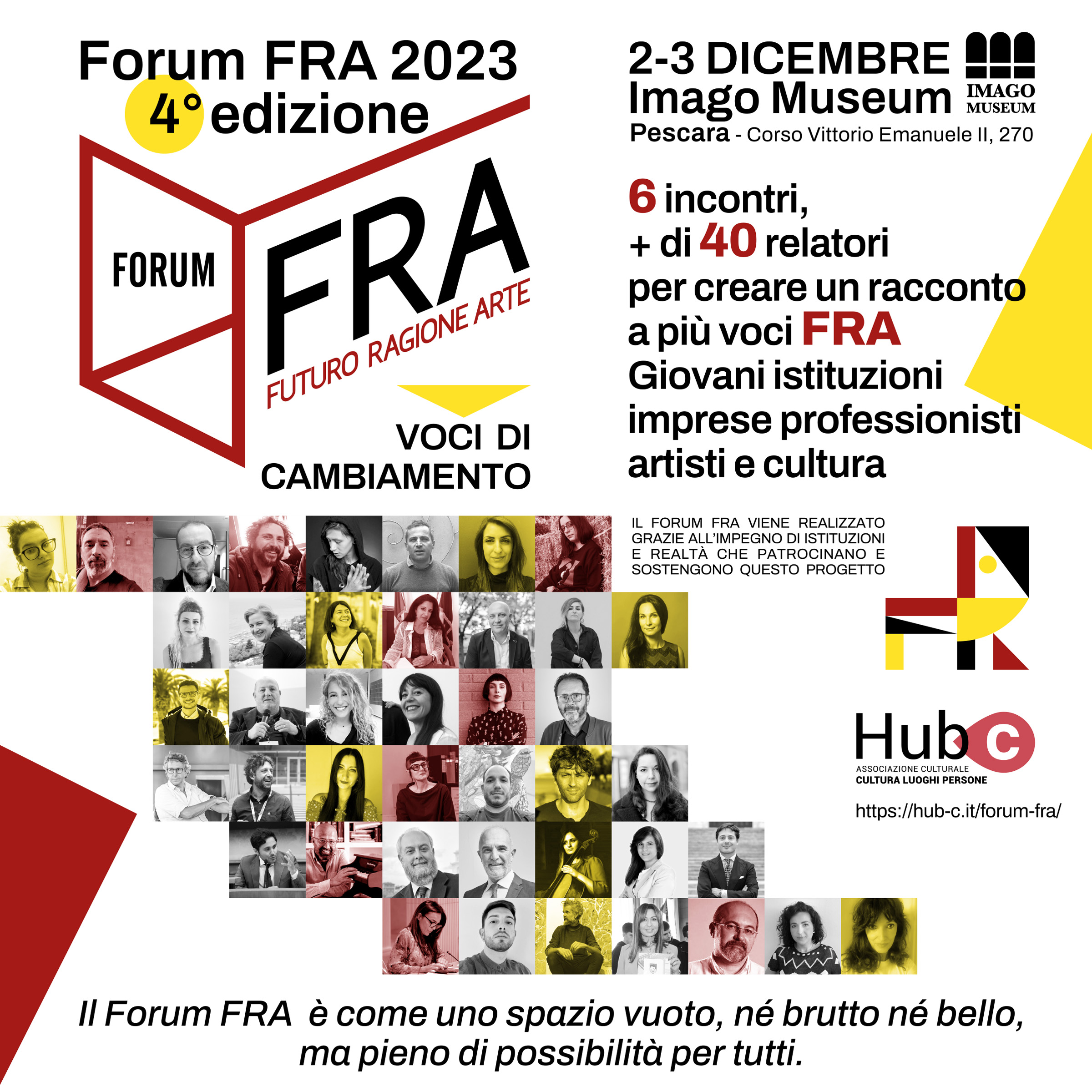 Dal 2 al 3 dicembre torna la quarta edizione del Forum FRA Futuro Ragione Arte presso l’Imago Museum di Pescara. Il Forum non è il solito convegno, va oltre le solite lezioni, saranno due giorni di Agorà aperta a tutte le persone, in particolar modo, alle giovani generazioni, agli artisti, alle istituzioni pubbliche e private, alle imprese e a chi lavora nel terzo settore e sente l’urgenza di rimettere al centro la relazione con l'altro come bisogno primario. Ospiti in conversazione tra loro, provenienze, generi, professioni ed età diverse che si intrecciano sul campo della cultura intesa come fattore produttivo di valore sociale ed economico di un territo-rio per creare un racconto a più voci su tematiche quali: giovani, istituzioni, impresa, artisti e cultura. Il Forum è un dialogo FRA persone in cui il pubblico è invitato a ripensare al ruolo passivo nel quale viene spesso confinato mediante un confronto diretto che permette a tutti di incrociare i pensieri e crescere insieme.