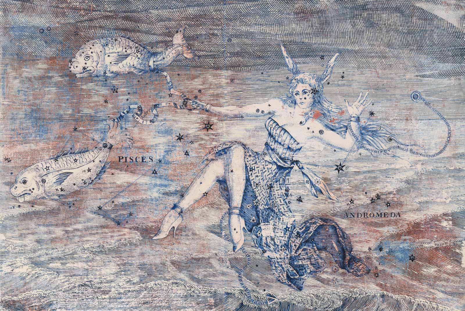 La mostra conduce lo spettatore in un viaggio fantastico dove, navigando di costellazione in costellazione seguendo il dipanarsi di un filo che segna traiettorie tra le stelle, si esplora una immaginaria mappa astrale, animata nel suo percorso da figure antropomorfe a rappresentare antichi miti.