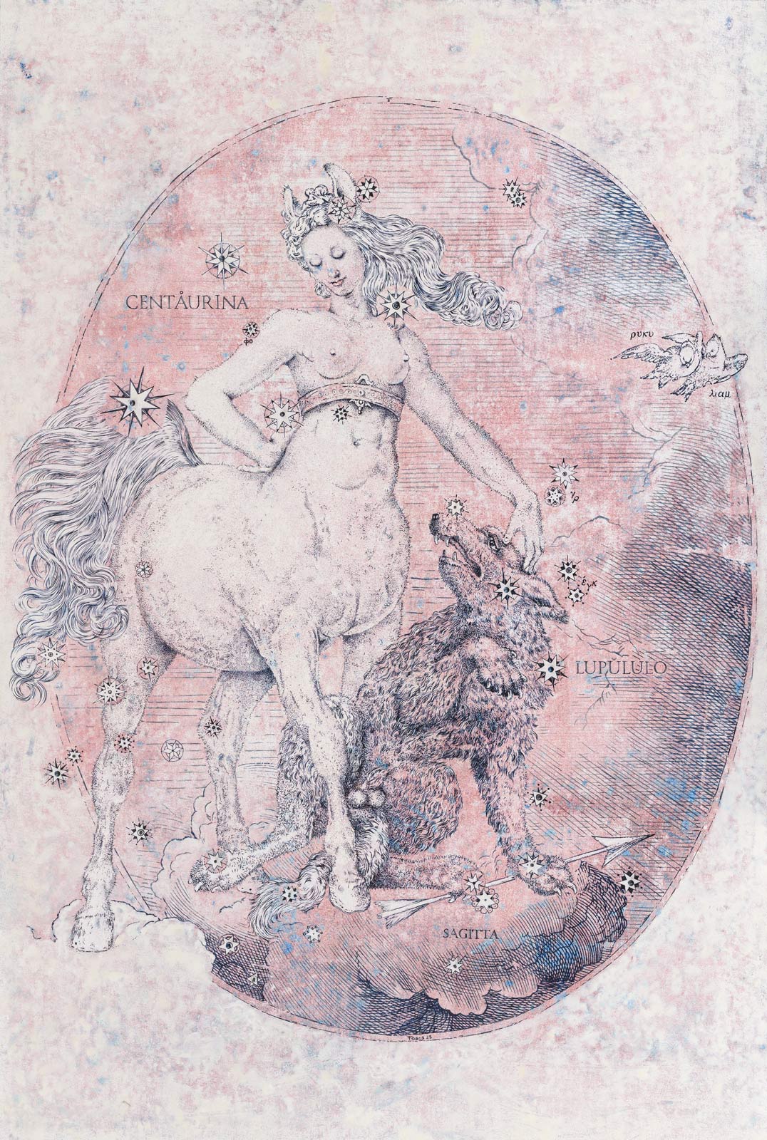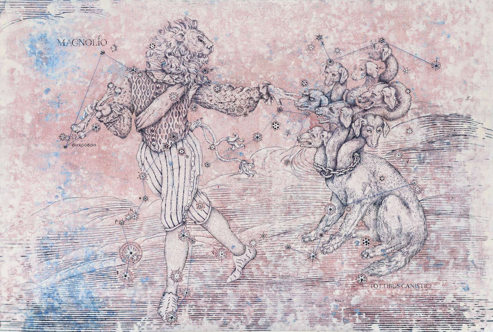 Undici dipinti e tredici disegni conducono lo spettatore in un viaggio fantastico dove, navigando di costellazione in costellazione seguendo il dipanarsi di un filo che segna traiettorie tra le stelle, si esplora una immaginaria mappa astrale, animata nel suo percorso da figure antropomorfe a rappresentare antichi miti a cui l'artista – nella sua personalissima reinterpretazione – regala nuova vita, nuove occasioni e parrebbe, in taluni casi, un inusuale lieto epilogo.