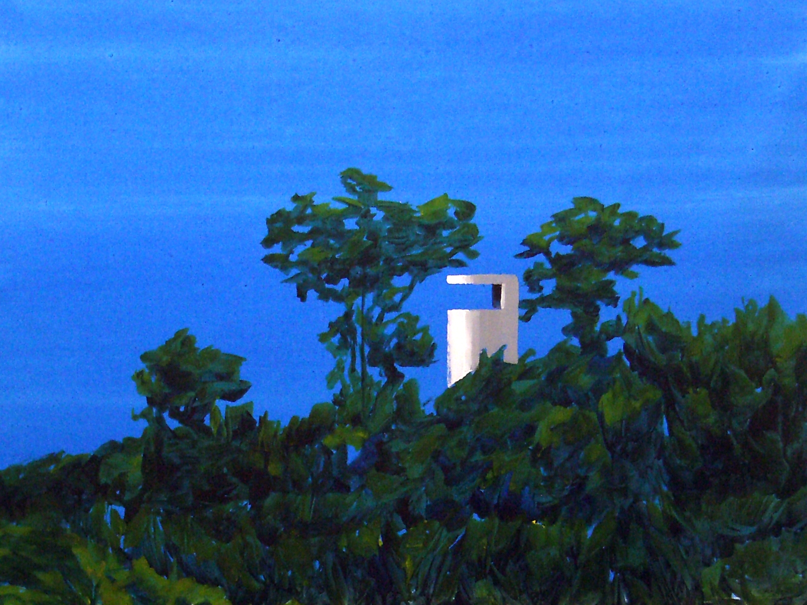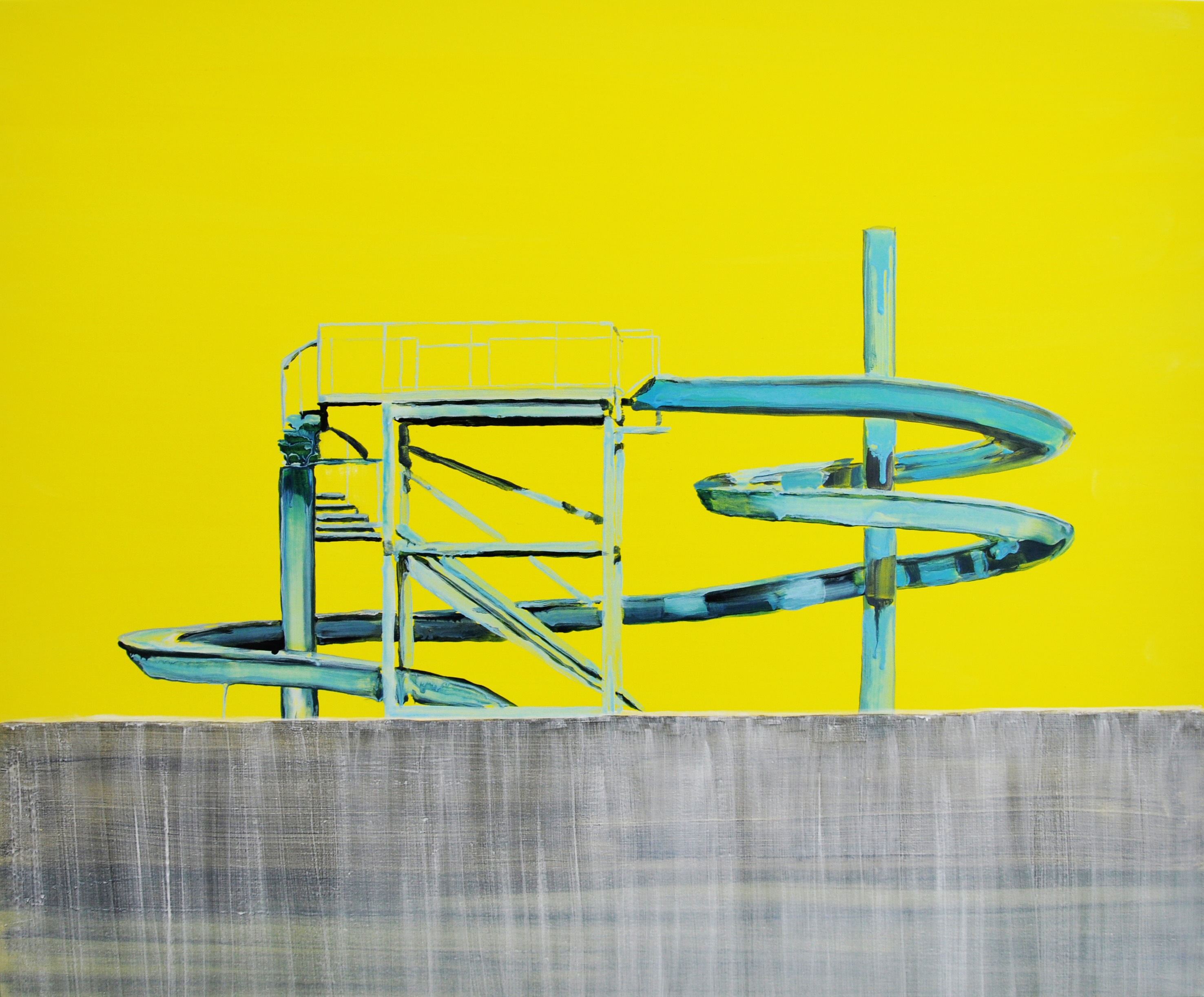 Sono situazioni allestite sempre con i minimi elementi strettamente necessari, senza orpelli di nessun genere, perché queste architetture devono trionfare al centro della scena come giocattoli esemplari (non a caso i colori usati spesso ricordano quelli dei mattoncini Lego). Strutture scheletriche si stagliano contro uno sfondo giallo impossibile, vediamo paesaggi fluidi in cui terra, cielo, vegetazione ed architetture sembrano fatti della stessa materia gommosa. Questo tipo di costruzione pittorica emana un avvolgente flusso allucinatorio. Le opere di Foschini/Iacomelli negano il realismo e finiscono per produrre una sorta di dimensione alternativa in cui quello che vediamo è un segnale ambiguo, una rappresentazione che allude al altri spessori più nascosti.
