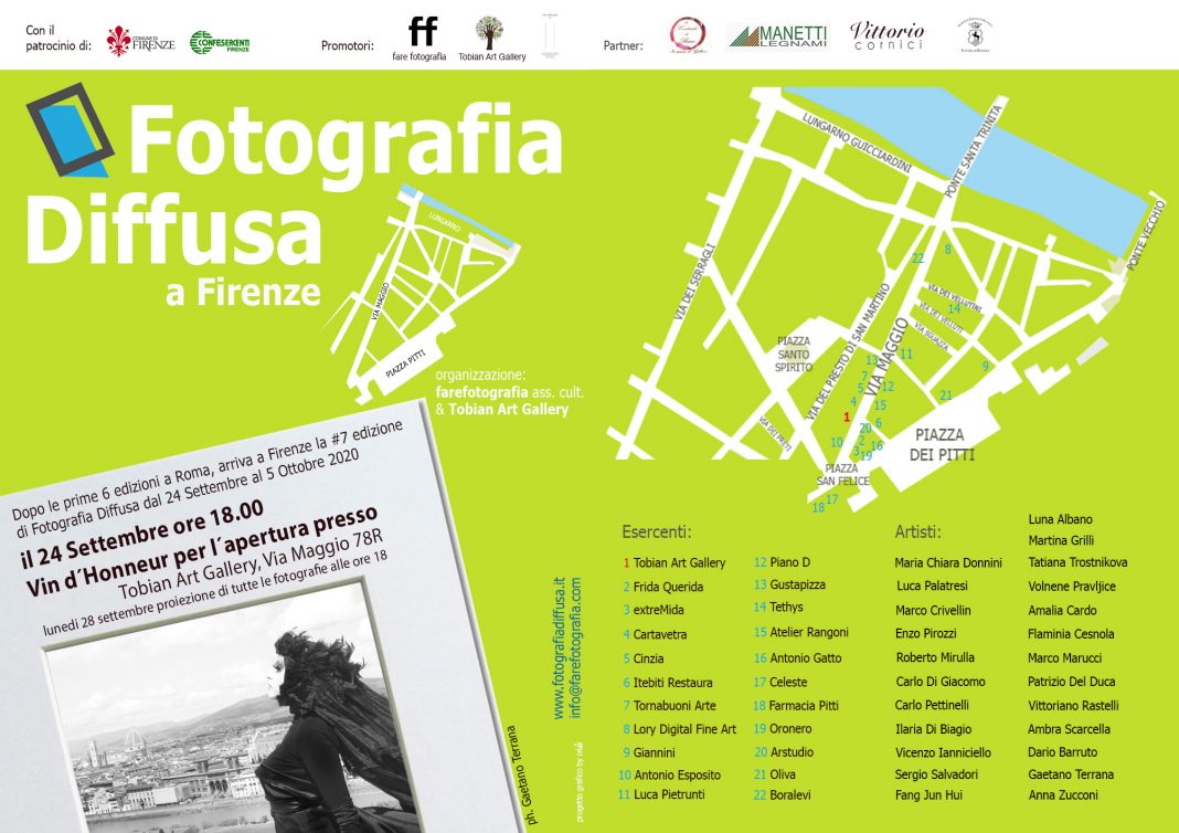 L’Associazione Culturale FareFotografia presenta FotografiaDiffusa co-prodotta con la Tobian Art Gallery, con il Patrocinio del Comune di Firenze e la Confesercenti, dove una fotografia esposta nelle vetrine di Via Maggio, Piazza dei Pitti e strade limotrofe, segnano un percorso d’arte immaginario.