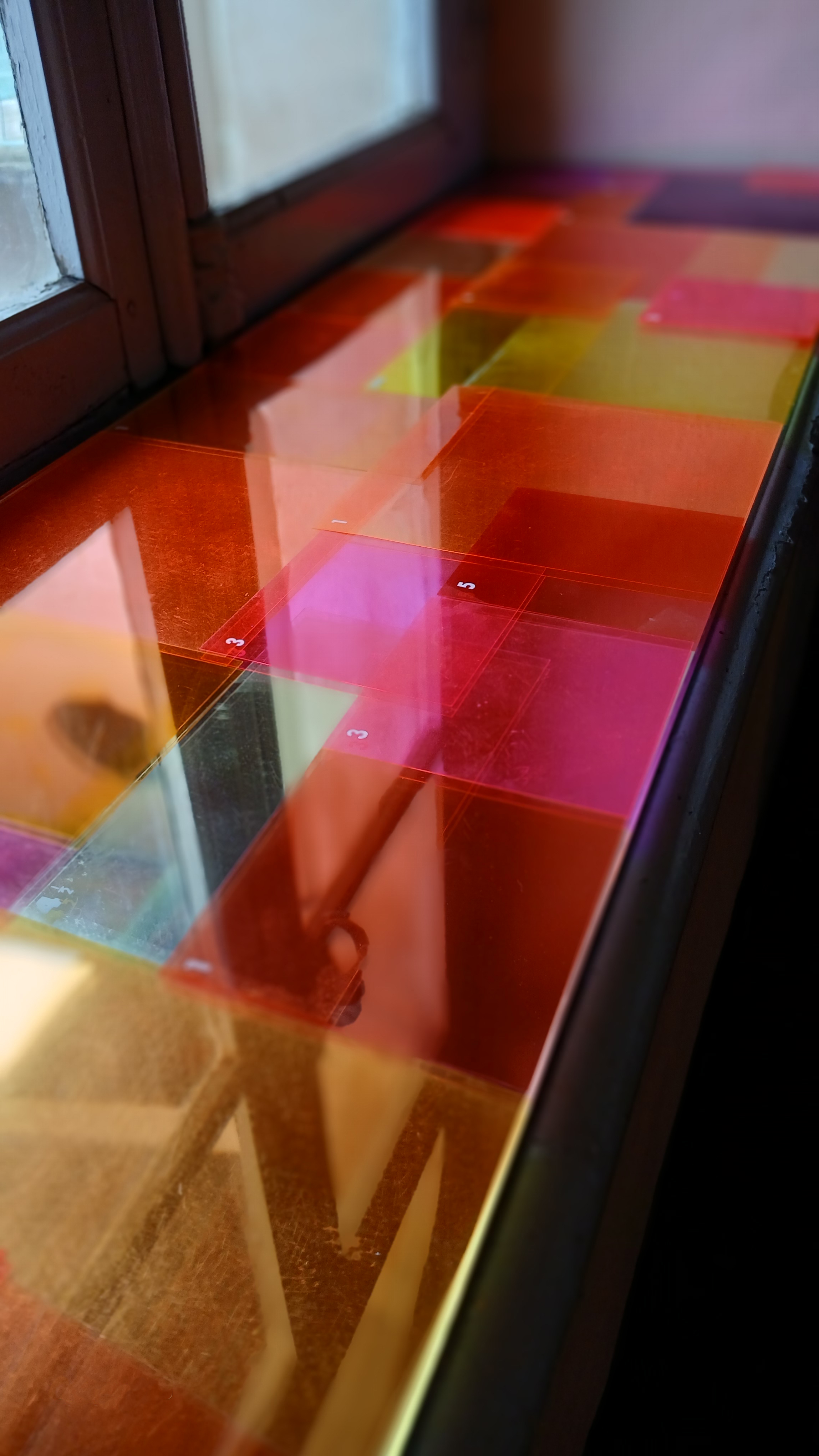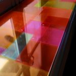 Villiam Miklos Andersen, esperto nell’uso della tecnologia, utilizza scansioni TC per generare forme per le sue cornici futuristiche, tagliate in vetro acrilico al neon; per l’immagine centrale realizza incisioni al laser su acrilico specchiato. La sua immagine high-tech di una fragola parla di frutti aumentati e di un accesso al cibo mediato dalle macchine. Bennie Flores Ansell è un’artista installativa di tipo diverso, in quanto fa riferimento alla fotografia in modo indiretto, attraverso reperti ausiliari o “dietro le quinte” come diapositive, filtri a contrasto variabile, bobine di pellicola ortografica 35 mm e pellicole dicroiche. Le sue sculture e proiezioni luminose riutilizzano in modo giocoso questi reperti analogici storici, richiamando l’atto stesso del fare fotografia.