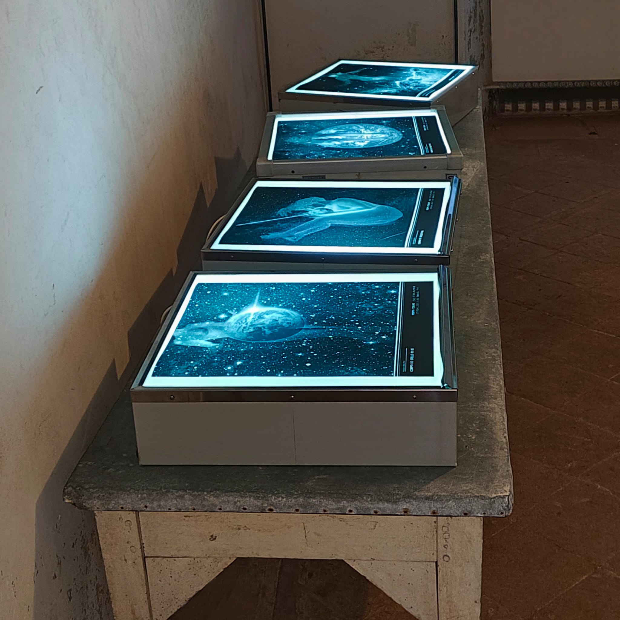 Altri artisti hanno abbandonato del tutto la stampa su carta o vi lavorano oltrepassandone i limiti. Silvia Gaffurini attraverso un approccio interdisciplinare, unisce fotografia stampata su papier calque, disegni a goffratura e AI generativa, dando forma ad un futuro che la realtà ha smesso di immaginare. Henrik Miklos Andersen e Roberta Toscano stampano su Backlight (una trasparenza positiva): nel caso di Henrik, composizioni di foto di famiglia sono retroilluminate con luci LED; per Roberta, immagini celesti ed extracorporee sono illuminate da lightbox medici. Il secondo lavoro di Roberta, in realtà una performance, prevede l'esplosione di forme di sapone nel microonde, che ricordano le sue fotografie di nuvole. Fabiola Ubani trasmette abilmente uno spazio sospeso tra presenza e assenza, stampando scene di grandi dimensioni di eterei paesaggi del letto su garza e vetro. Anche Olga Caldas realizza un’atmosfera immersiva con installazioni: stampa su tessuto per vestire l’ambiente domestico con tovaglie, tappeti e tende. Inoltre, la sua tavola apparecchiata ospita fotografie stampate su piatti di ceramica. Oona Hyland, attratta anche lei dal linguaggio carico dei vasi di argilla - di materialità, territorio e ideologia - applica astrazioni fotografiche su brocche di ceramica.