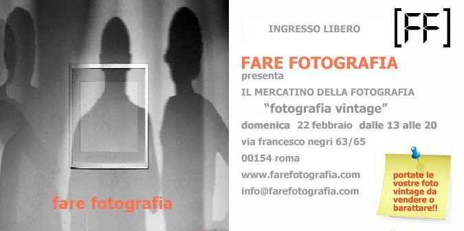 Avrà luogo la seconda edizione di “la domenica del mercatino della fotografia”. In questa edizione saranno presenti archivi fotografici del ‘900 riprodotti con la stampa digitale: fotogrammi della memoria ri-prendono vita attraverso un procedimento moderno di stampa.