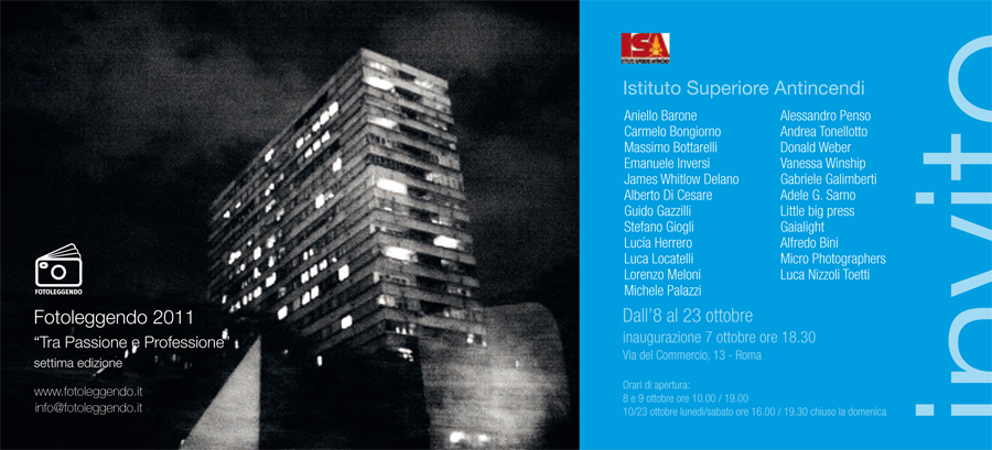 Dal 7 ottobre, si entra nel vivo di FotoLeggendo con l’ampia programmazione all’ISA- Istituto Superiore Antincendi. Un ricco itinerario di 18 mostre, proiezioni, incontri col pubblico e letture del portfolio, le quali rivolgono una particolare attenzione ai giovani fotografi. Le mostre, aperte fino al 23 ottobre offrono uno sguardo eterogeneo, sul mondo e l'attualità, ma anche sull’intimità e l’introspezione.