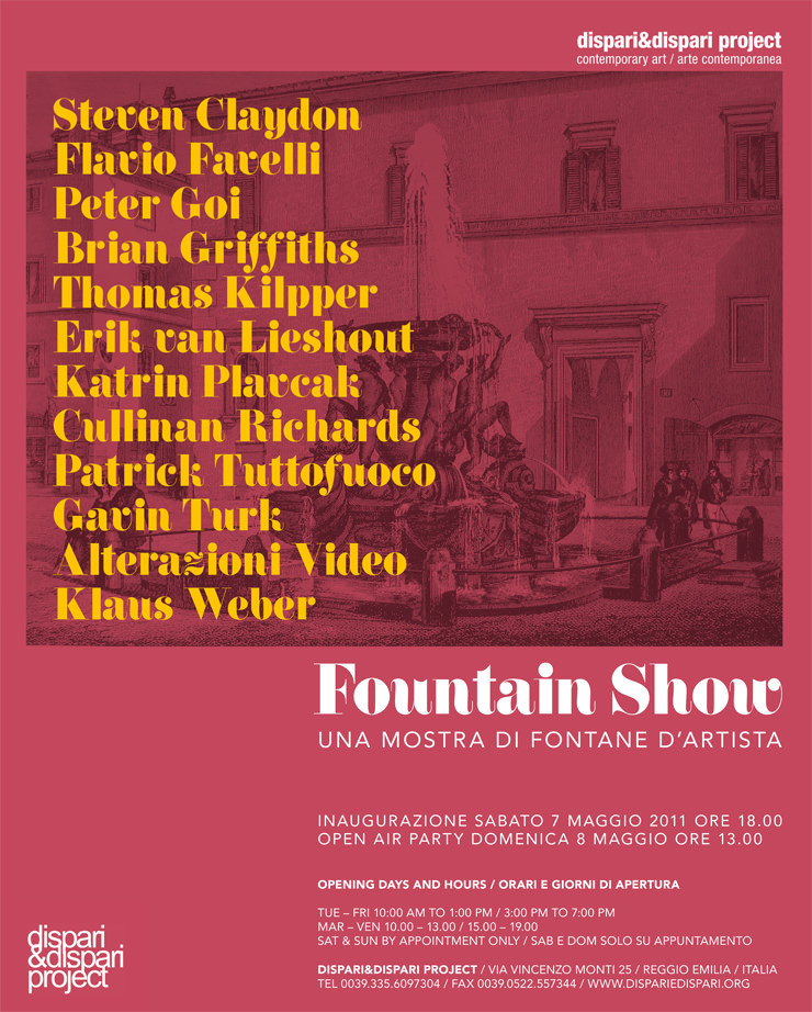 La mostra 'Fountain Show' inaugura durante il weekend del 7 e 8 maggio dalle ore 18.00 in poi, e rimarrà aperta al pubblico fino al 18 Settembre 2011. Per maggiori informazioni visita www.dispariedispari.org