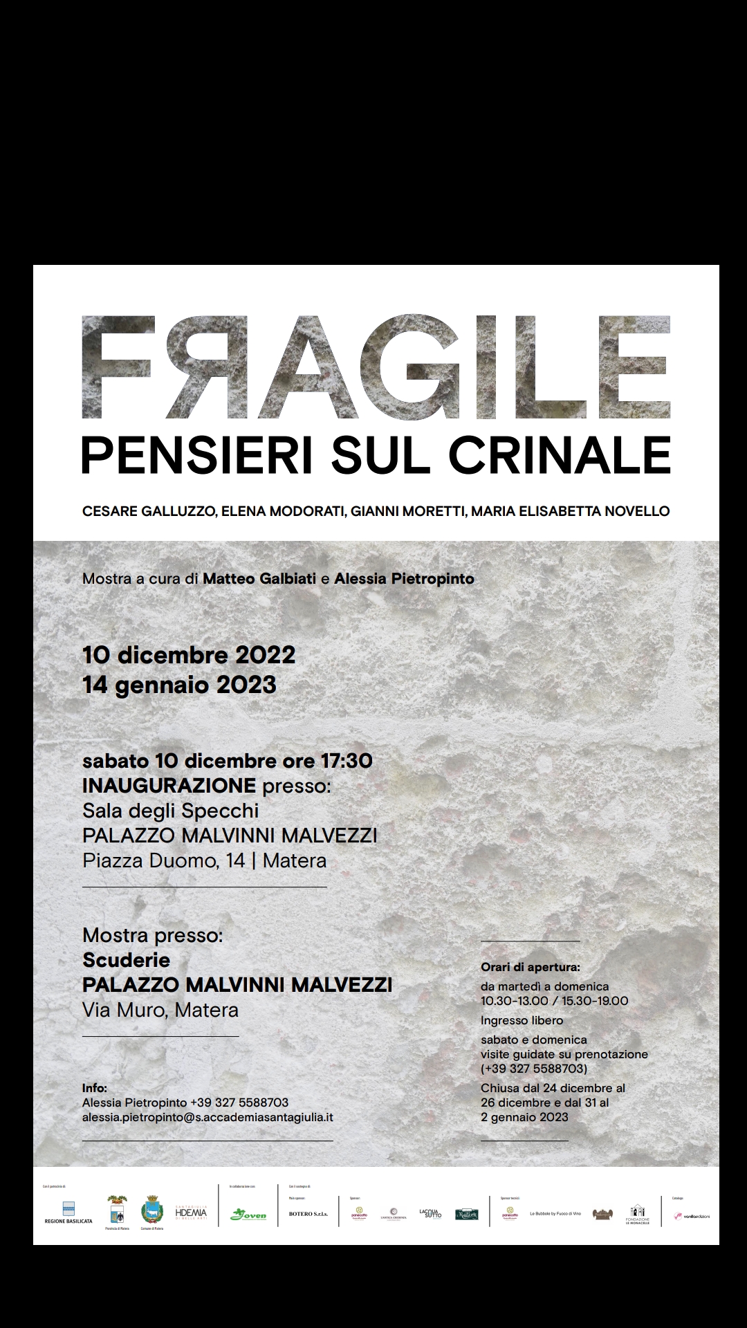 FЯAGILE. Pensieri sul crinale è una mostra d’arte contemporanea collettiva – a cura di Matteo Galbiati e Alessia Pietropinto – che vede partecipi opere di quattro artisti italiani in dialogo con la città di Matera.