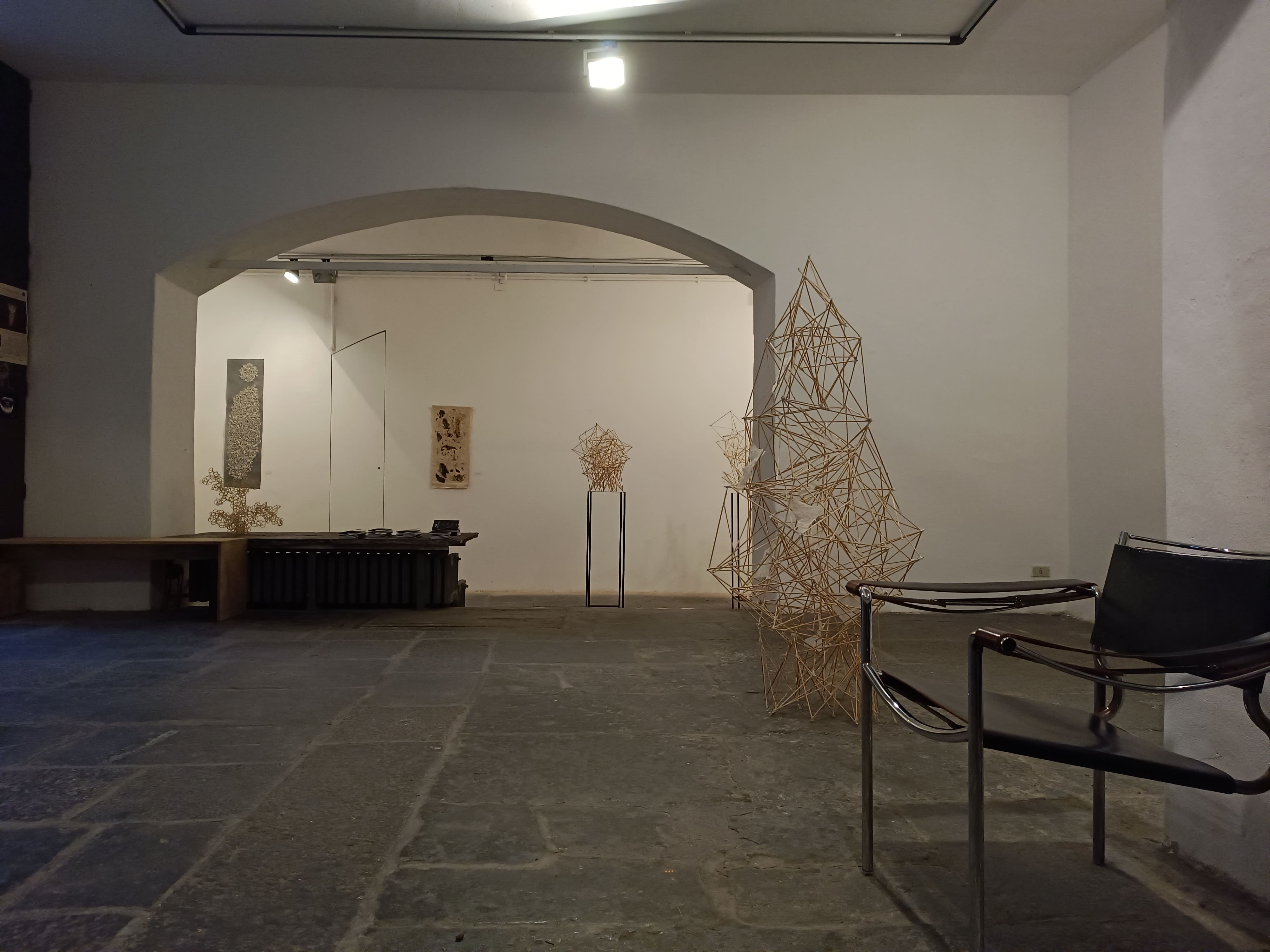 “Architettura instabile”, “Disordine costituito”, “Composizione caotica”, “Costruzione genetica” sono i titoli eloquenti di un modo di concepire l’arte partendo dall’ordinario, dallo scarto, dal residuo, dall’accidente. Un’arte inclusiva la sua, che non discrimina e che salva, invece, il progetto in cerca di definizione, l’intuizione non compiuta, l’approdo mancato – o se si preferisce, quell’ “anello che non tiene” di montaliana memoria che qui prende le forme sempre più interstiziali di fili di carta attorcigliata, di bave di colla, di bastoncini e tarlatane che ci reggono su aeree impalcature fatte di silenzio e di vuoto.