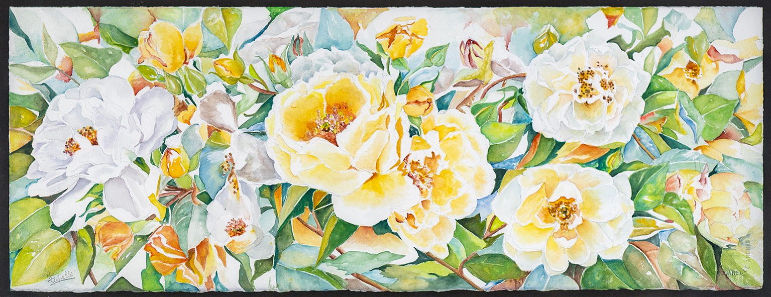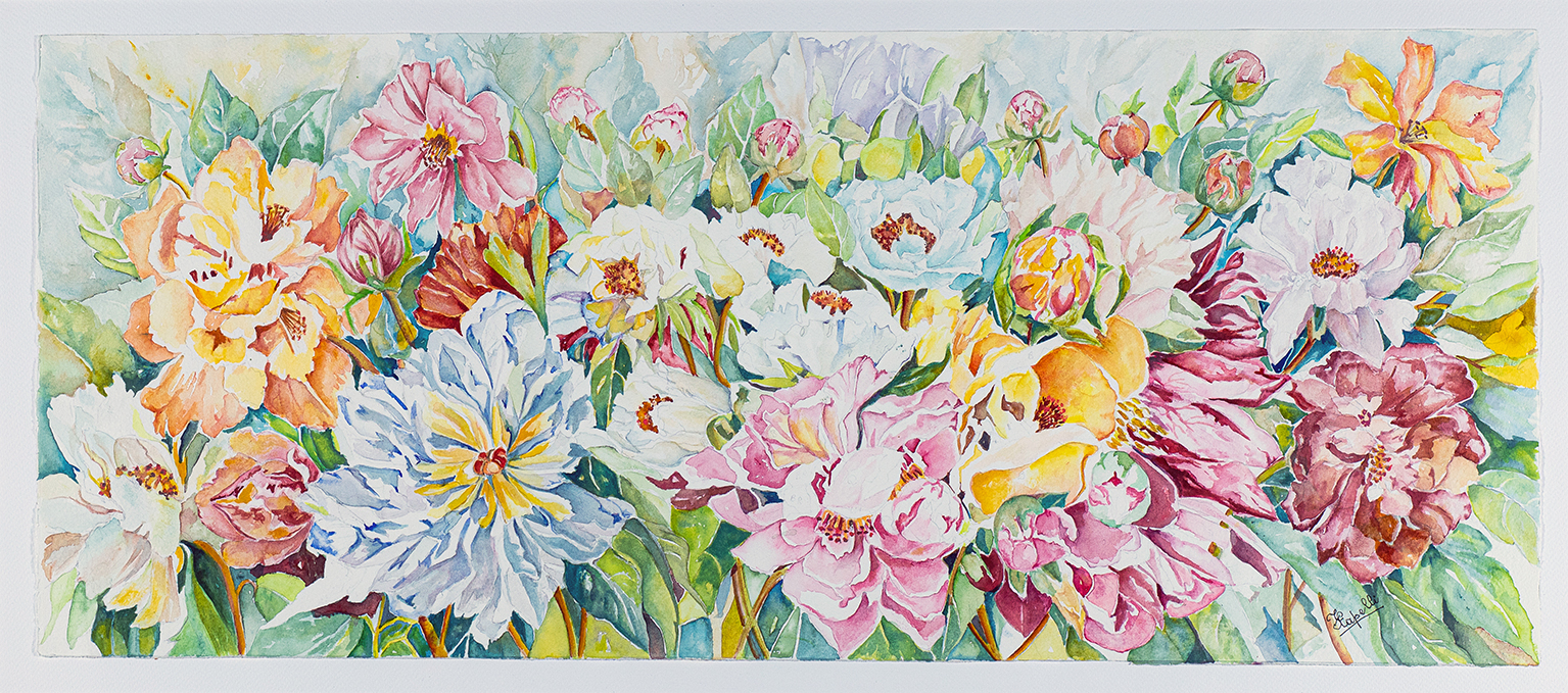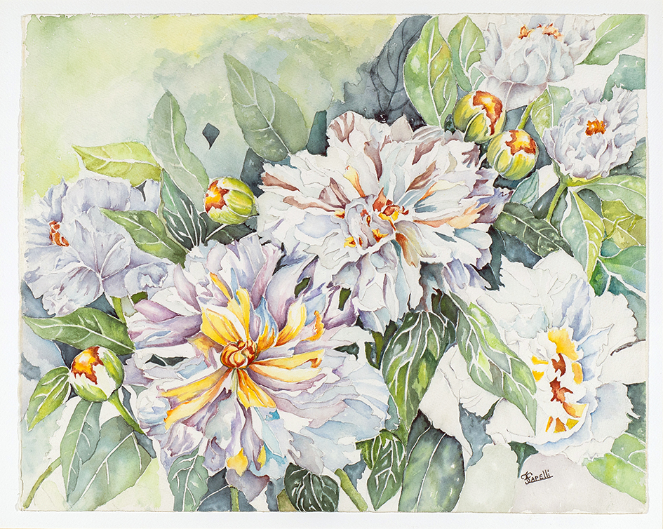 Francesca Capelli ama i fiori, ne ama il colore, la forma e sensazioni, il profumo, senza preclusione ad alcuno. Sono un dono che la Natura ci fa, alla quale, lei è grata per la possibilità che le danno di manifestare la sua bravura nella loro rappresentazione, ché nel tempo sono diventati i soggetti preferiti dei suoi acquerelli. Ed i fiori sono i veri protagonisti dei dipinti, perché riempiono completamente il foglio, non c’è spazio per sfondi o altro, solo fiori, dall’inizio leggermente disegnati, poi riempiti di colore con la tecnica dell’acquerello a foglio asciutto, non c’è spazio per la casualità o la ricerca dell’effetto del bagnato, i colori devono ubbidire alla mano di Francesca che li conduce con abilità.