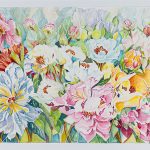 I fiori sono i veri protagonisti dei dipinti, perché riempiono completamente il foglio, non c’è spazio per sfondi o altro, solo fiori, dall’inizio leggermente disegnati, poi riempiti di colore con la tecnica dell’acquerello a foglio asciutto.