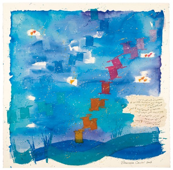 Gli acquerelli di Francesca offrono una doppia lettura: da lontano hanno l’energia di coloratissime e armoniose forme astratte, mentre da vicino rivelano i loro segreti. È da vicino, infatti, che si scopre un mondo parallelo al nostro, popolato di piccoli esseri strani e delicati, infantili ma saggi, ironici e aggraziati, che amano la musica, i libri, la danza e l’amore. E amano anche le parole, che l’autrice scrive in forma di poesie su ognuno dei suoi quadri. Chi guarda, chi legge, può lasciarsi guidare dal prezioso e filiforme Ernesto, che compare e scompare dalle opere di Francesca. Lui, quando ha voglia e tempo, la conduce per mano nel suo fantastico viaggio dentro un sogno infinito.