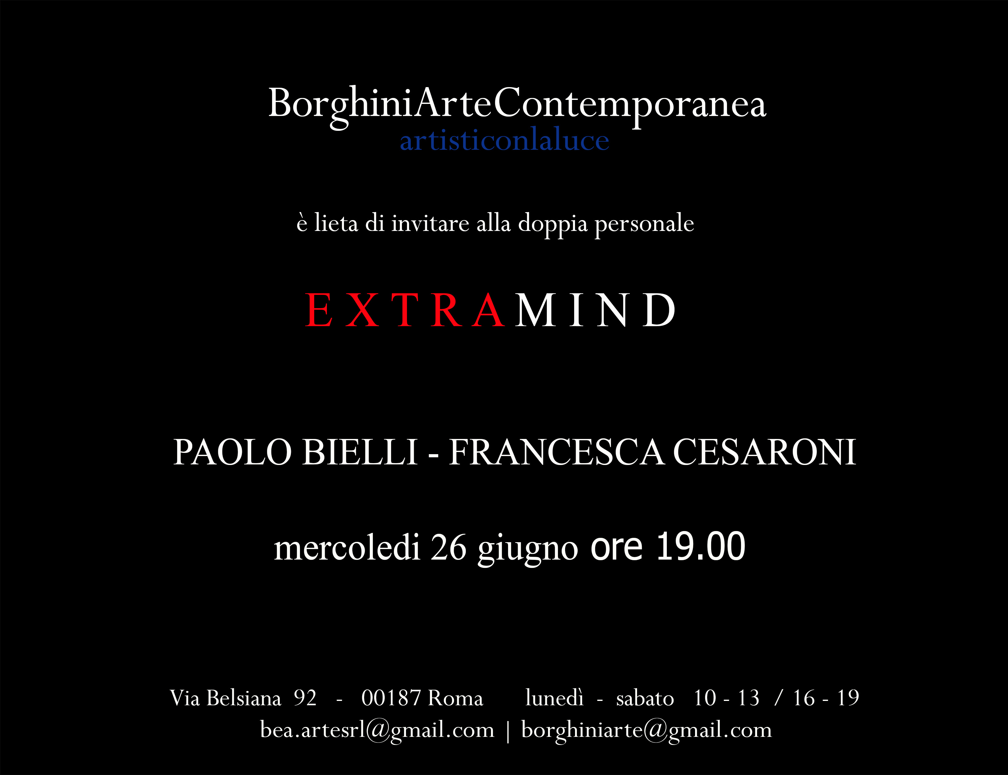 Vi invitiamo all’inaugurazione della prossima mostra presso la galleria Borghini Arte Contemporanea (RM), intitolata Extra Mind, nella quale saranno esposte le opere degli artisti: Francesca Cesaroni e Paolo Bielli.