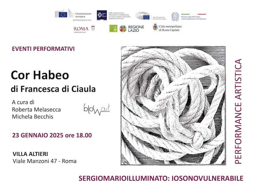 Continua il ciclo di eventi performativi ‘Dal corpo al corpo dell’arte’ a cura di Roberta Melasecca e Michela Becchis, realizzati nell’ambito di IOSONOVULNERABILE di Sergio Mario Illuminato: giovedì 23 gennaio 2025 alle ore 18.00 la performance ‘COR HABEO’ di Francesca di Ciaula.