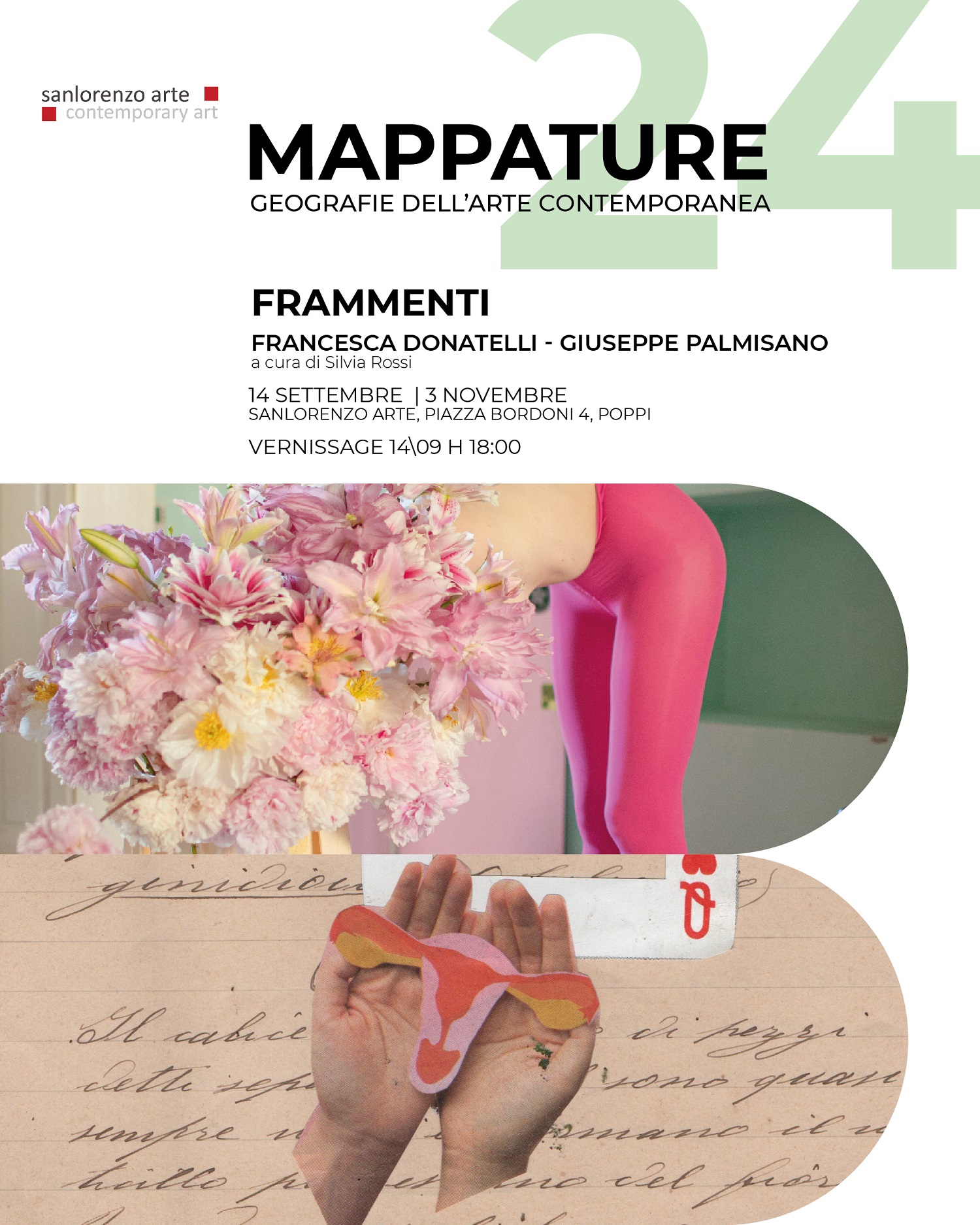 “Frammenti”, l’ultimo appuntamento espositivo della rassegna “Mappature 2024” alla Galleria SanLorenzo Arte, nasce dall’incontro di due linguaggi artistici differenti ma complementari: i collage di Francesca Donatelli e le fotografie di Giuseppe Palmisano (iosonopipo). Attraverso dieci collage e dieci fotografie, allestite in uno spazio carico di storia come l'ex chiesa di San Lorenzo a Poppi, la mostra costruisce un dialogo tra il grande e il piccolo, tra la particella e l'insieme, tra il visibile e l'immaginato. Il tema del “frammento” è il filo conduttore dell’intera esposizione. Ogni opera, sia essa un ritaglio di carta o una fotografia, rappresenta una porzione di realtà.