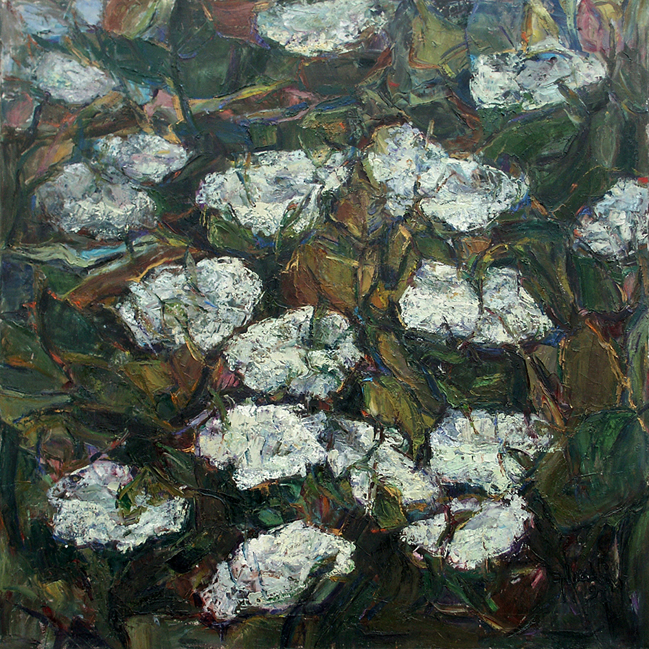 Torna in modo potente ed evidente la creazione della Natura, con al suo interno anche la forza della distruzione, in quel masso rosso della Roccia infuocata (2.A), che al contempo è per Francesca altresì un ardere di amore. Apparentemente in antitesi, in verità altra faccia della stessa Natura, è Il torrente che porta la vita (2.B) dal chiaro titolo, ma anch’esso possibile portatore di catastrofi. L’opera viene caricata di materia in particolare nel «rivo strozzato che gorgoglia», composto con delle increspature in basso rilievo. Formato da blocchi di colore informi è Un mucchio di letame (2.C), comprensibile solo grazie al titolo, che pare uno dei paesaggi più ‘spinti’ di Paul Cézanne. Lucchini, in effetti, in alcune sue opere sembra guardare in parte al Postimpressionismo come nel Campo di grano e nel Rilievo verde. La tavolozza impiegata per il letame riappare ‘germogliata’ pressoché simile nel Sambuco in fiore (2.D), sebbene privata del nero ‘umido’ e con l’aggiunta di pennellate di azzurro non evidenti ma che premono per venire a galla e, con esse, tutte le corolle del fiore.