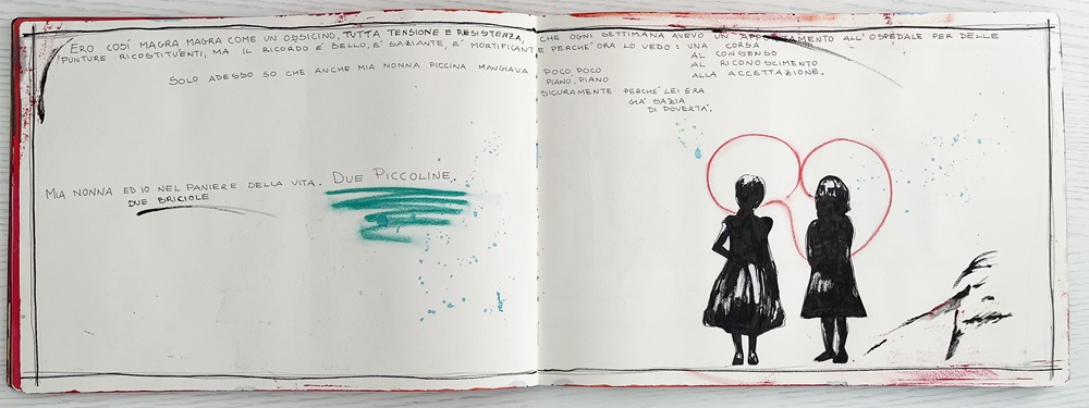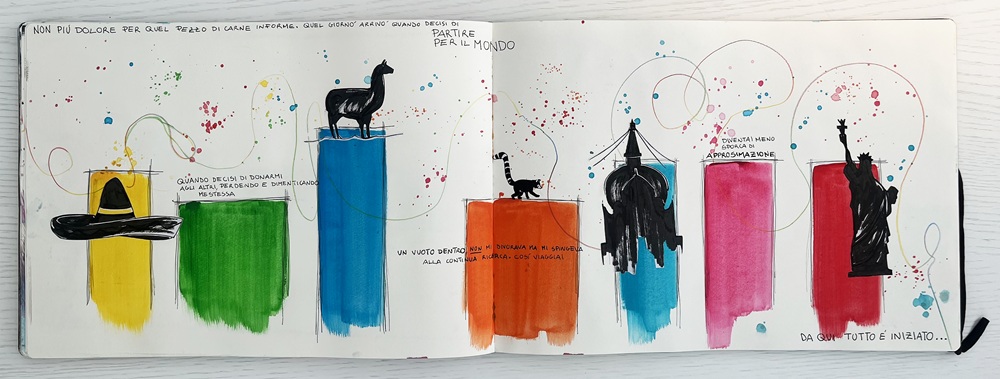 Il racconto si traduce in pennellate, che si rincorrono con dipinti, talvolta immaginifici, di eventi distruttivi che saranno poi la ricetta di una ricostruzione profonda, il risultato simbolico di due vite intrecciate, affiancate, riposte nelle 27 pagine di un libro d’arte di grande formato da sfogliare (90cm x 126cm chiuso, 90cm x 252cm aperto - tecnica mista, carta su tela, copertina in pelle).