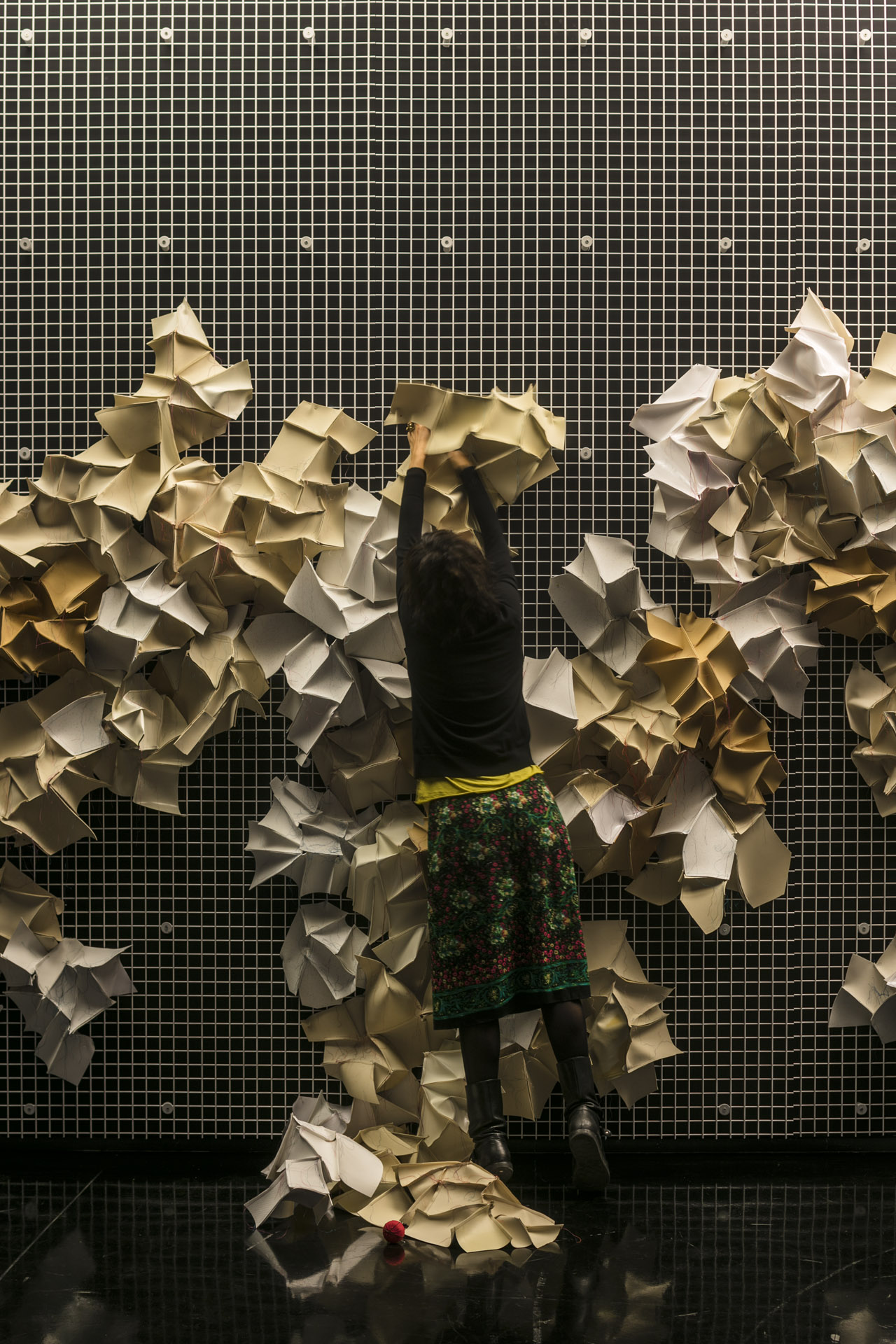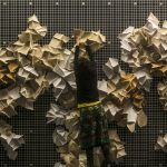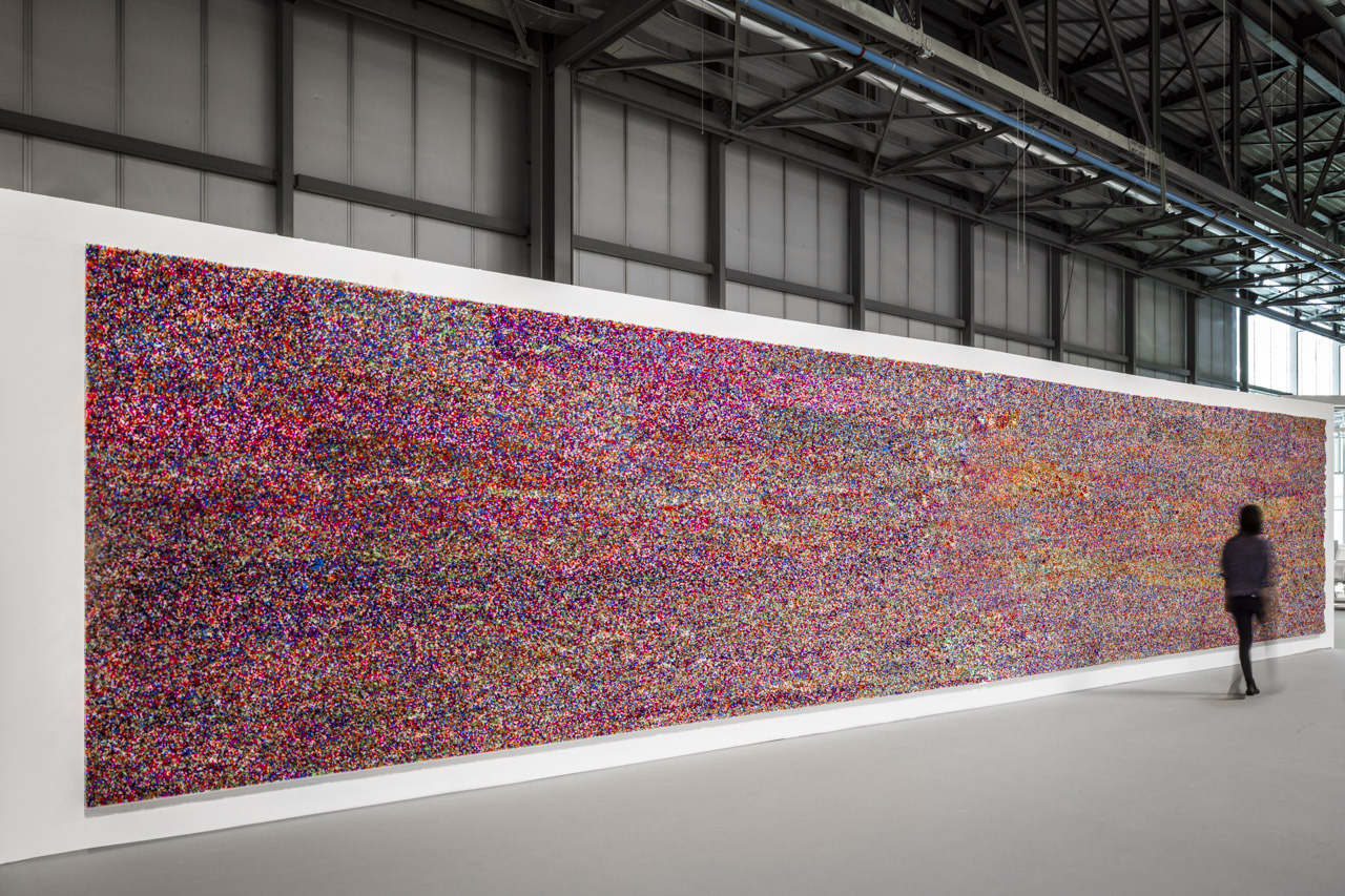Considerata inquinante e spesso denigrata, la materia plastica che Francesca Pasquali utilizza, si riattiva e riscatta il proprio ruolo, diventando alfabeto di un linguaggio vitale e affascinante: come nel caso della grande installazione di migliaia di cannucce di plastica che creano un meraviglioso pattern cromatico che vibrando seduce lo sguardo e chiama a sé il pubblico, invitandolo a domandarsi cosa stia osservando e a sperimentare l’effetto di fono assorbenza dei suoni circostanti che i piccolissimi oculi plastici sanno accogliere e assorbire. Un Wall dinamico e in apparente moto perpetuo, un magma tellurico che inevitabilmente rimanda al mistero della creazione delle cose e del mondo.
