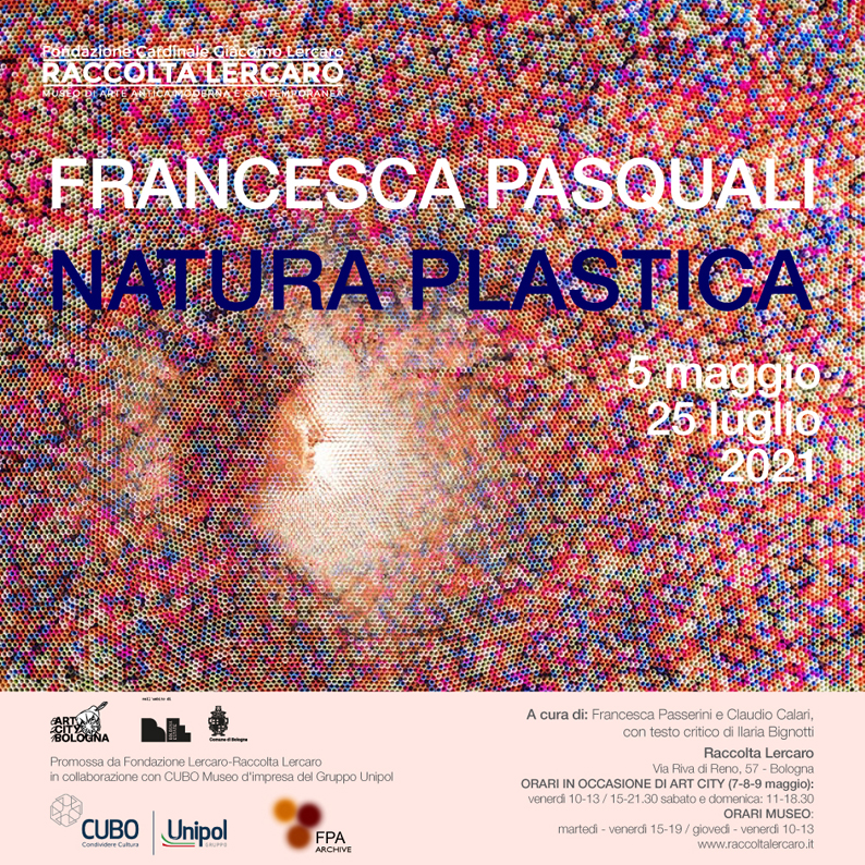 La Raccolta Lercaro in collaborazione con CUBO-Museo di Impresa del Gruppo Unipol, è lieta di ospitare, in occasione di ART CITY Bologna 2021 promosso dal Comune di Bologna nell'ambito di Bologna Estate, un percorso immersivo e coinvolgente nelle recenti opere di Francesca Pasquali, la cui ricerca è notoriamente rivolta alla trasformazione e riconnotazione dei materiali plastici e industriali, spesso di riuso, elaborando complesse installazioni appositamente pensate per lo spazio che le ospita.