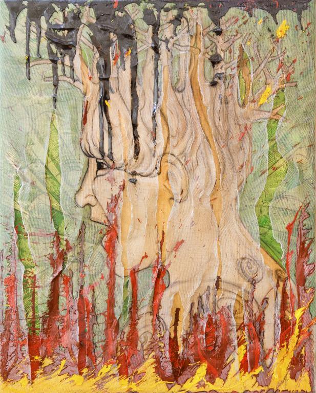 I volti, le figure, perfettamente riconoscibili nelle opere, sono la materia organica, convocata a descrivere il legame indissolubile dell’uomo con la memoria, il ricordo, l’esperienza che è alla base dell’identità. Ma l’uomo e la sua identità sono, come già accennato, anche perenne diacronica, pensiero, mutamento: da ciò il variegato ventaglio di possibilità rappresentative e una visione-fruizione a 360°. Un uomo che è entità complessa: astratta e fisica al contempo. Perciò, la necessità di una materica raffigurazione (i visi, i corpi), avvolta da spirali e resa da micro-polveri metallizzate policrome soffiate e miste ad acrilici. Un punto di partenza tangibile e chiaro da cui si dipana una narrazione cromatica e di luce in cui convivono composizione e scomposizione. Le spirali assurgono a testimonianza e sembiante del movimento, del vortice, delle differenti prospettive. Personaggi dalle fattezze evidenti, quasi mai dal sesso definito, però, mostrano una fissità dello sguardo, che anela ad abbracciare la triplice cronologia di presente (il dato reale concreto), futuro (il divenire), passato (la memoria incancellabile e imprescindibile).