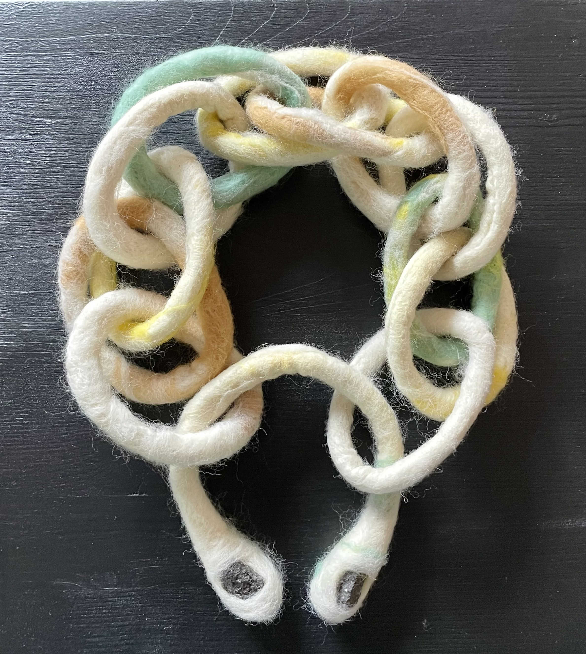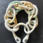Luca Fontana scrive di lei per questa mostra: “Francesca Pizzo Scuto è un'artista dalle molteplici dimensioni, in grado di esplorare e fondere vari linguaggi espressivi. È difficile identificare una forma di espressione che prevalga in modo netto, poiché nel corso della sua carriera le sue pratiche artistiche si sono intrecciate e sovrapposte in un percorso concettuale dove nessuna disciplina prevale sull'altra. Anzi, ogni aspetto della sua arte contribuisce in modo paritetico alla costruzione di un linguaggio che si manifesta come una coesistenza libera e coerente di visioni, suoni e gesti…. Il concetto della pittura non-pittura trova senso nella fusione sensoriale per collocarsi in una dimensione immersiva più ampia e dove l’armonia si porta a compimento quando musica, scultura e pittura vivono all’unisono nello spazio espositivo. In mostra a Catania anche due opere realizzate in feltro che si sviluppano entrambe attorno al concetto di “modulare”. Un monile con inserti di pietra lavica, e una seconda che fa parte della serie “M.A.R.”, - Modulare, Angolare, Riparare - realizzata in feltro e perle scure".