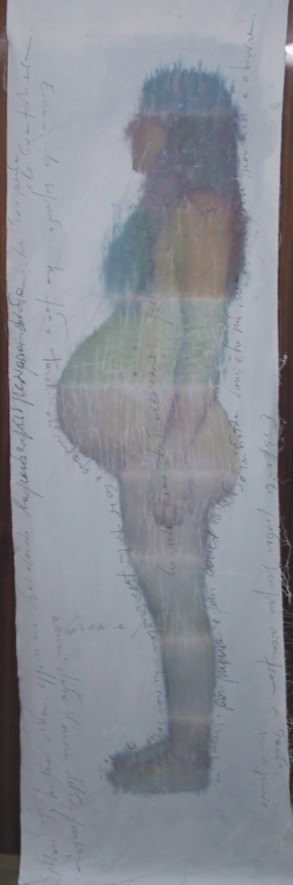 “ Il tema della maternità da tempo è al centro della ricerca di Francesca Scammacca (Lentini, 1974): maternità intesa non solo come momento unico e irripetibile nella vita di una donna, in cui si arriva ad una totale compenetrazione di corpo e anima tra madre e figlio ma come simbolo, assoluto e supremo, di vita dentro la vita, dono o esperienza, carico o impegno, che solo alla donna, e non all’uomo, è dato di compiere. Le sue scelte tecniche - stampa fotografica e disegno su tela - derivano dall’esigenza di realizzare opere-sindoni che non temono il richiamo, anzi lo cercano, ad uno dei più importanti simboli della religione cristiana. Alle sue sindoni Francesca, peraltro lontanissima da qualsiasi rivendicazione di tipo femminista, chiede di portare dignitosamente ed orgogliosamente l’immagine di una donna incinta perché niente, a suo avviso, può esprimere meglio l’idea di un dio, simbolo di vita nella vita e per la vita. “