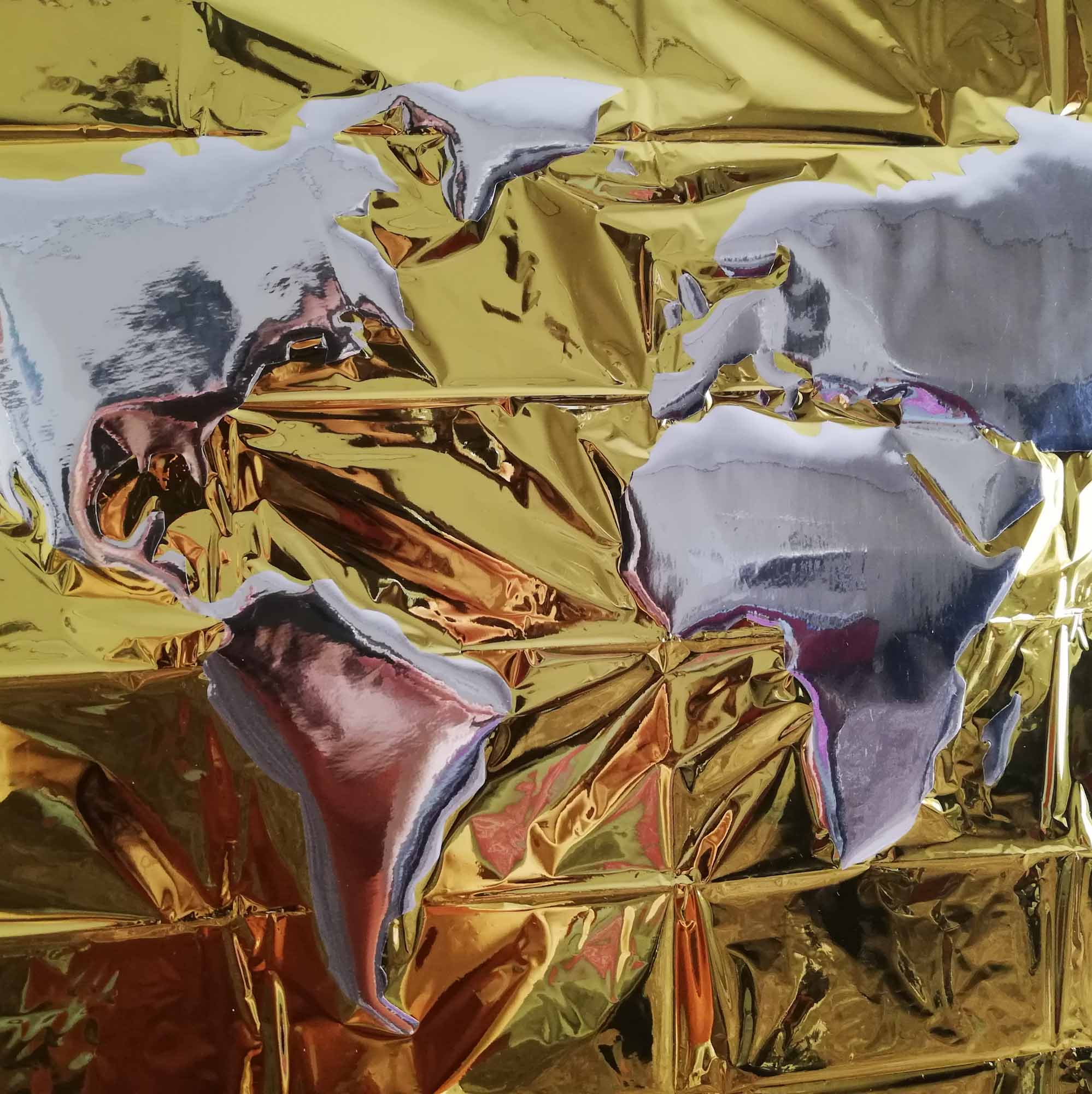 (9 +1) nove scatti still life, con frammenti di coperta termica, per un percorso di salvataggio della terra, dove l'essere umano è il più grande tesoro, una riserva aurea per l'intero pianeta, da custodire e curare, stampate su carta chromaluxe 40x60 .