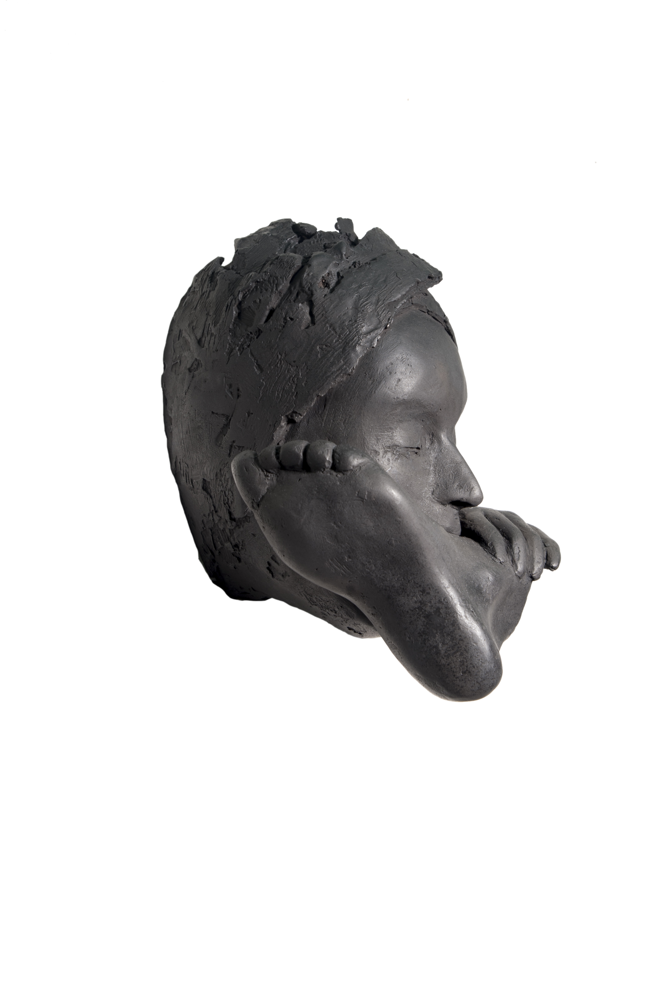 Una piccola testa in ceramica adagiata sul lato e posta su una base scura, evidenzia che il soggetto è stato schiacciato, manomesso e le impronte della mano che ha compresso la creta sono lì a testimoniarne il gesto.