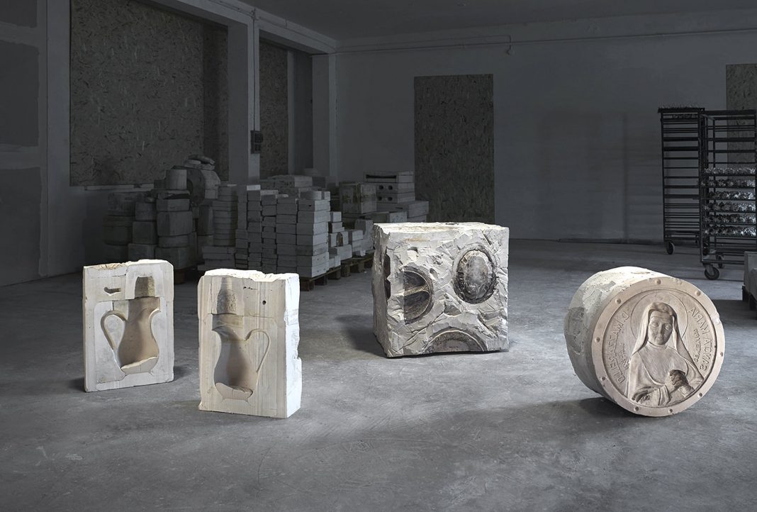 I Manufatti Fossili che occupano la prima sala espositiva, sono masse piene, corpi in gesso agglomerati in forme, impilate e poi sezionate. Il gesto necroscopico svela, oltreché la sagoma interna degli stampi, la volontà di Ardini di trasformare ciò che rimane di un manufatto archeologico, come rilievi portati alla deriva, dalla corrente. Questa progressione registra un approccio entropico verso la materia, la ceramica ora resta un lontanissimo ricordo, abbandonata quasi completamente, per accogliere la forma scultorea come solo svago alla complessità creativa. La mutazione insorge, portando a condividere nella volumetria, aspetti del figurato quanto del suo stesso confine.