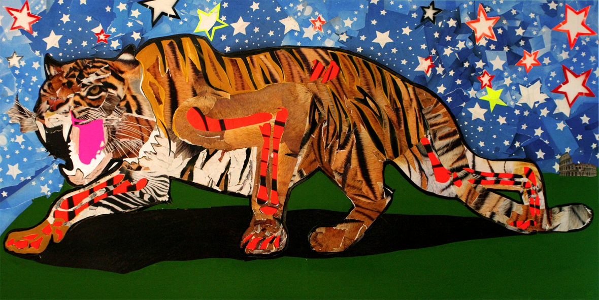 opera è uguale infinito. L’artista utilizza la tecnica del collage.