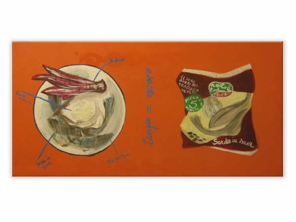 La piramide dei bisogni di Maslow viene reinterpretata ed adattata al concetto. Il risultato è l’opera Pic nic con Maslow la quale mostra, su una superficie quadrettata che richiama la tessitura propria delle tradizionali tovaglie da pic-nic, una piramide rossa alla cui base Bellon pone il bisogno del nutrirsi, seguito da quello di saziarsi e di condividere. Al vertice della piramide l’ artista colloca il termine “ardire” inteso come tessitura di relazioni sociali che si vengono a creare nel contesto conviviale. Se la prima parte del progetto è dedicata ai “Commensali” ed ai Sensi in tavola (titolo di un opera realizzata con carta velina resinata), la seconda ha come protagonista il “cibo”. L’ opera in acrilico Brand Name ripercorre le diverse fasi del processo che porta dal prodotto tipico della cucina locale (qui il riferimento è a quella padovana, caratterizzata da piatti come Le sarde al saor, la polenta o il radicchio) al packaging industriale (il cibo surgelato pronto in 5 minuti). La scritta Tempo=Amore mostra come l’attitudine di dedicare tempo alla cucina nell’ottica conviviale si risolva oggi in soluzioni culturali e di mercato che sfruttano gli archetipi che stanno alla base del desiderio, dell’immagine e della tradizione. Si nota in opere come queste un atteggiamento critico nei confronti della società contemporanea, ancora più evidente e radicale in opere come “Ogni civiltà ha il suo prezzo” dove anche il rapporto tra il cibo e l’utensile viene concepito in un’ottica di costrizione sociale. Le norme alla base del rito diventano prigioni che soffocano una spontaneità del gesto che può essere recuperata mangiando una mela, gesto che si risolve nel suo compiersi e che quindi si contrappone al ritmo stabilito ed imposto dalle diverse portate di un pranzo a tavola (Ritmo). Oltre alle connotazioni socio-antropologiche, Bellon analizza la tavola come ambiente, studiando le possibile situazioni ed atmosfere che si possono venire a creare a seconda della luminosità dello spazio, dei suoni, dei rumori, delle intenzioni e stati d’animo dei soggetti. Da sintetiche ed efficaci soluzioni grafiche si passa quindi all’atto creativo della tavola stessa come concetto: la pittura si svincola dalla forma (regole e norme sociali), si libera nella spontaneità del gesto in un’ottica più mistica che rituale recuperando la propria valenza eidetica (relativa all’idea, essenza fenomenica prima e originale). Il risultato sono le diverse Tovaglie realizzate in acrilico: del cavaliere, del singolo, del solo e della condivisione. Rappresentazione istintiva della fase precedente alla progettazione. Rimane una visione dall’ alto ma l’ immagine e il tratto pittorico è svincolato dalla rigidezza del diagramma o dello schema. Dal rigore formale del design l’ artista passa all’ immediatezza e alla libertà della pittura. Dalla tavola, come luogo e spazio relazionale, alla sostanza emozionale e profonda che permette il suo compiersi.