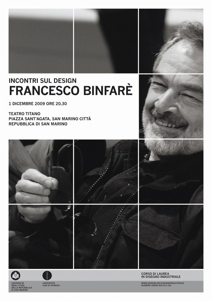 Il ciclo annuale Incontri sul design, organizzato dal Corso di laurea in disegno industriale dell’Università degli studi della Repubblica di San Marino, propone il 1 dicembre 2009 al Teatro Titano (piazza San’Agata, San Marino Città) alle ore 20,30, l’appuntamento con Francesco Binfarè, designer che ha lavorato, a partire dagli anni settanta, con le maggiori aziende del design italiano (Cassina, De Padova, Venini, Edra, Magis).
