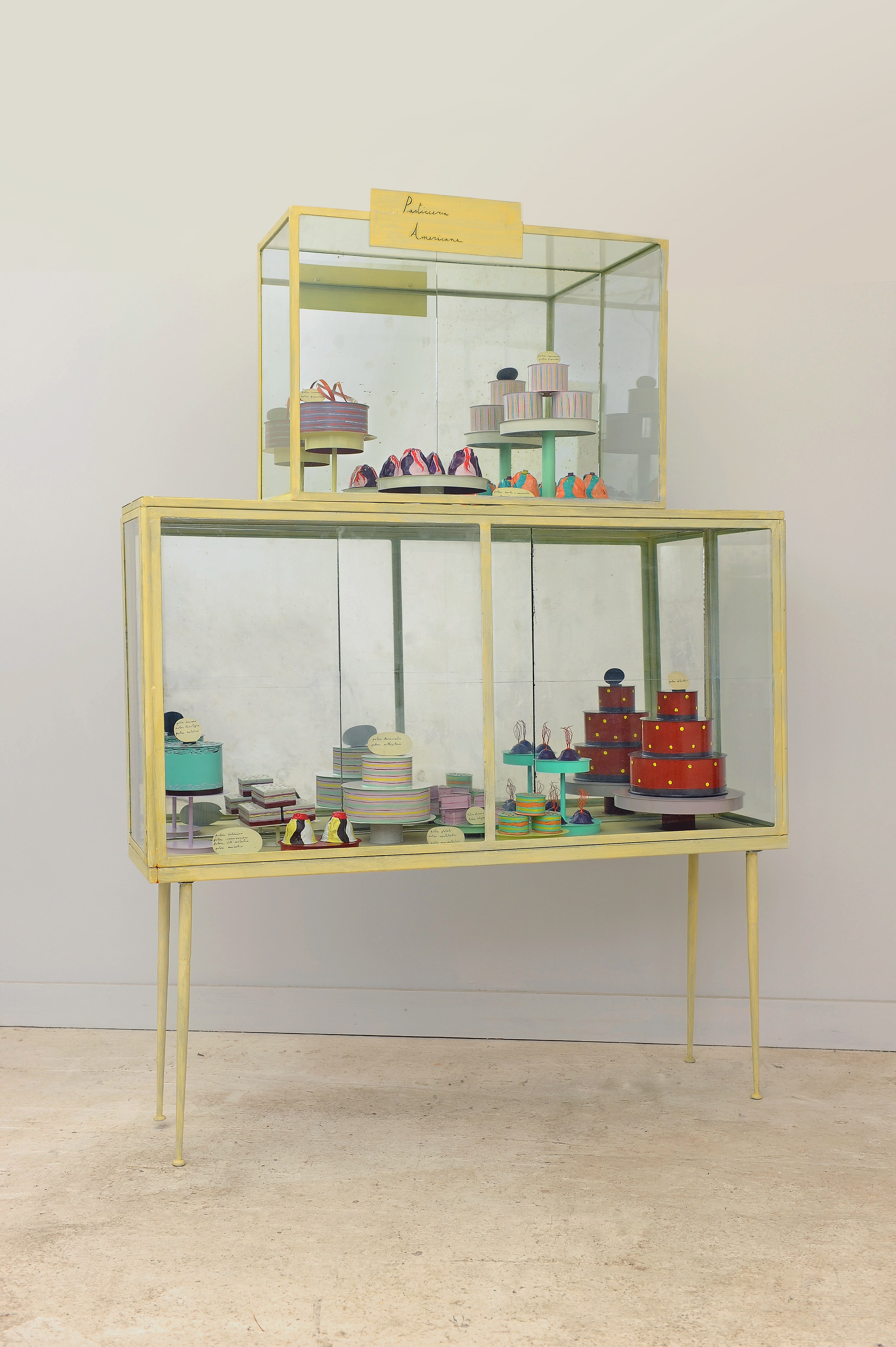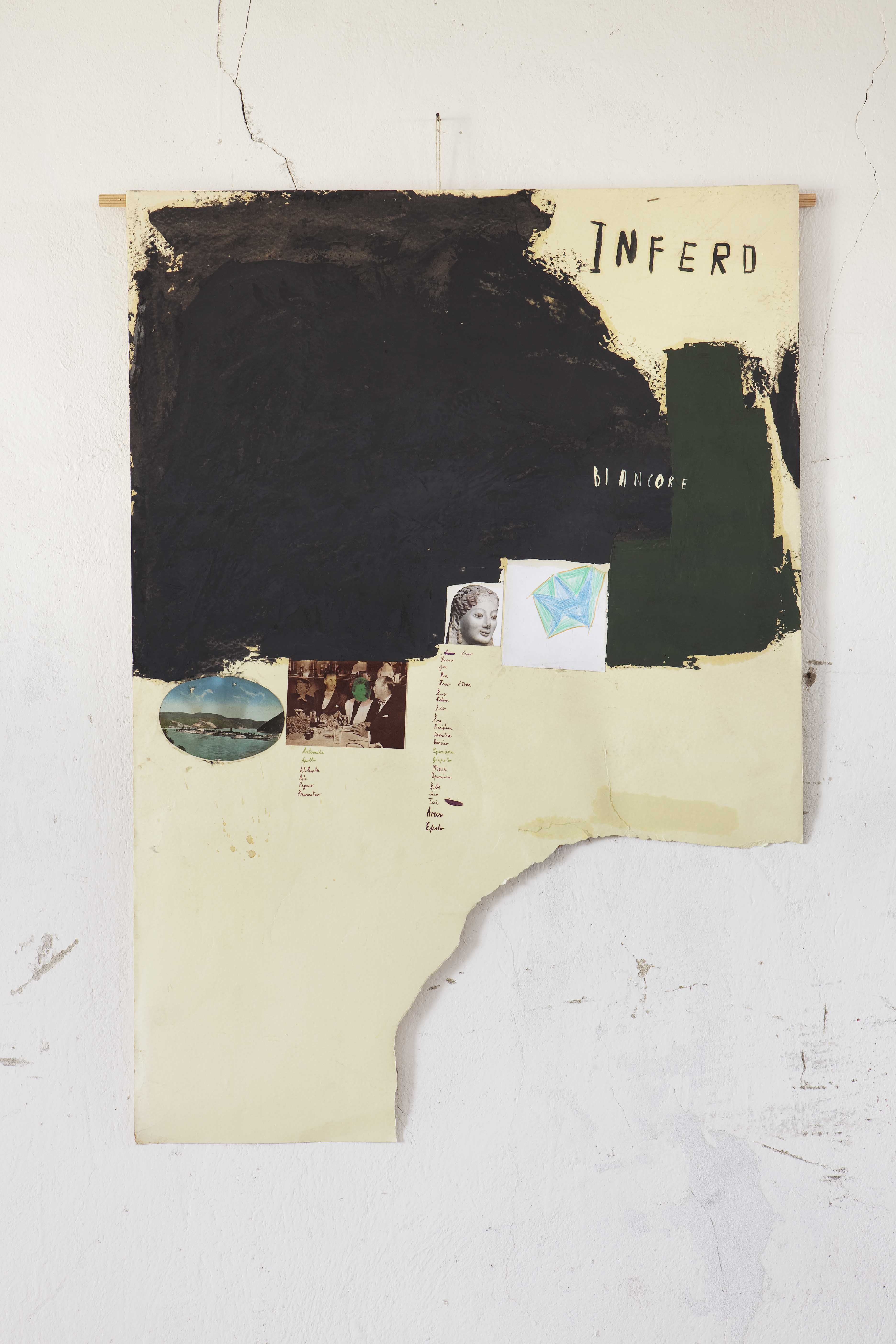 […] le opere accolgono straniamenti visivi che incorporano minute scritte di grafie misteriose a piccole immagini – un disegno trovato per terra, un frammento di fotografia – oppure si dispiegano nel grande gioco delle carte dove il colore, forte, implacabile, diretto, ha il sopravvento. Nelle vetrine, il gioco raggiunge una dimensione superiore, nella quale si fatica a discernere la presenza dalla realtà: il pensiero dell’artista è dominato da una sorta di grandiosa ironia che non sai se voglia provocare lo spettatore o l’autore che ne riempie gli spazi, lui stesso vittima, da provocatore a provocato, di congiungimenti forzosi ma comprensibili, tutti a cercare di ritrovare la linearità di un significare che spezza i normali nessi logici.