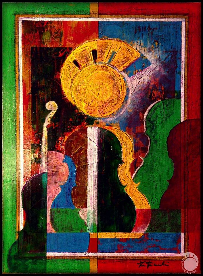 La metafora della “nota tenuta” - questo il termine tecnico utilizzato dagli “addetti ai lavori” - esprime l’essenza profonda delle opere di Francesco Donadei, artista romano che utilizza un linguaggio trascendentale, simbolico, lontano dalla realtà, per raccontare il suo universo interiore, animato soprattutto dai suoi cari.