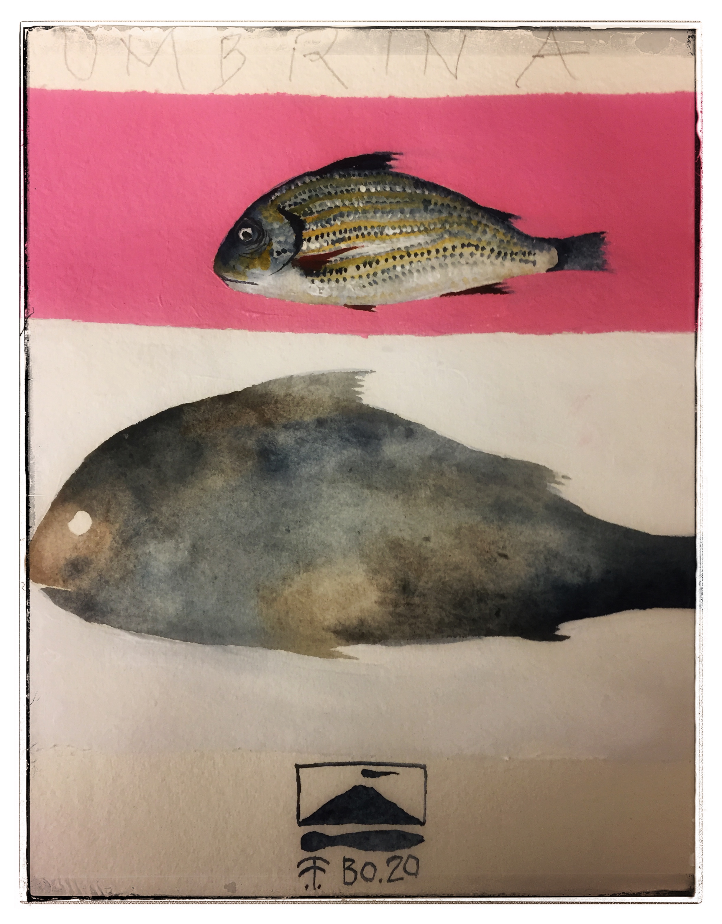 lavori ad acquarello di una serie, chiamata Calembour, originali e divertenti “pesci”, nei