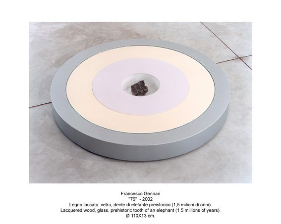 Una natura ricreata anche attraverso opere tridimensionali, siano essi "ready-made tecnologici" o oggetti fatti realizzare espressamente dall'artista. Alla prima categoria appartengono due lavori esposti alla Pescheria, Come se e Microcosmo. Il primo è un cipresso, della lunghezza di tre metri, che è stata stabilizzata attraverso una sostanza chimica che blocca il deperimenro organico della pianta morta, mentre Microcosmo è una zolla di terra nella quale l'artista ha inserito due insetti vivi (un ragno e un lombrico) prima di sigillarla ermeticamenre e dipingerla d'oro. L'idea di bloccare le condizioni di vita di microscopici esseri viventi sta alla base di opere significative come 1,6%, un cubo di terra ricoperto di verri colorati che contiene sei vermi, sei ragni e sei semi. In questo caso, il titolo si riferisce sia all'area di tre aperture poste sulla superficie del solido (che corrisponde all'I,6% del totale) che alla percentuale di possibilità di sopravvivere dei suoi abitanti coatti. Un'ipotesi sviluppata successivamente nel Mausoleo per un verme: una costruzione geometrica realizzara con intarsi di legno di faggio e riempita di zucchero, dove l'artista ha inserito un verme. Se in questi lavori riecheggia la memoria ludica di una "natura in miniatura" presente in alcune opere di Pino Pascali (penso sopratturto a due lavori noti, il Mare e il Metro cubo di terra) un'opera come Quindici appare invece piu vicina alla poetica di Piero Manzoni. Si tratta di un contenirore circolare del diametro di un metro e trenta realizzato con tre elementi concentrici caratterizzati da colori diversi, con al centro un foro dove è contenuta una vertebra di balena preistorica, che risale a tre milioni di anni fa. Un singolare memento sul valore del tempo, e sulla capacità di un giovane artista come Francesco Gennari di farci riflettere su tematiche fondamentali per la storia della cultura contemporanea.