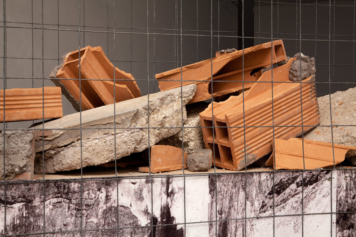 L’ambiente di passaggio tra le due sale presenta accumuli di legni e griglie di ferro, appoggiati alle pareti come fossero abbandonati, mentre nel centro della seconda sala un’unica installazione domina la scena. Si tratta di una semplice architettura geometrica, che custodisce al suo interno detriti di foratini sotto i quali sono appese tre immagini identiche e capovolte dell’Himalaya.